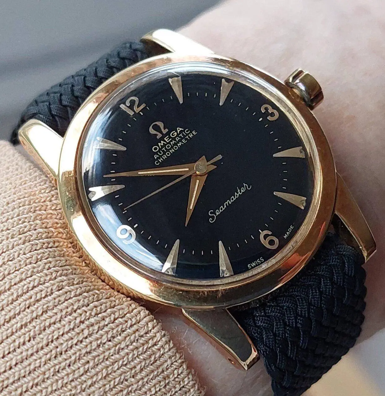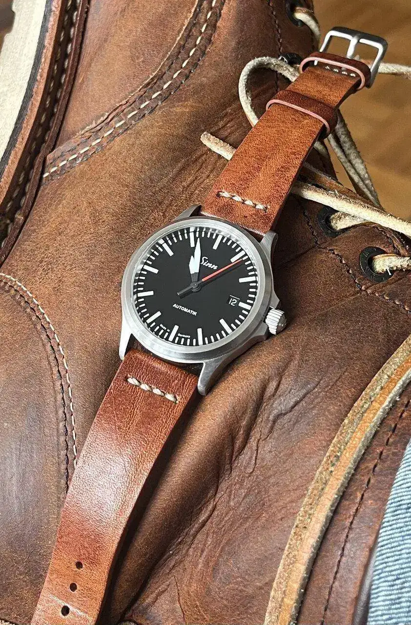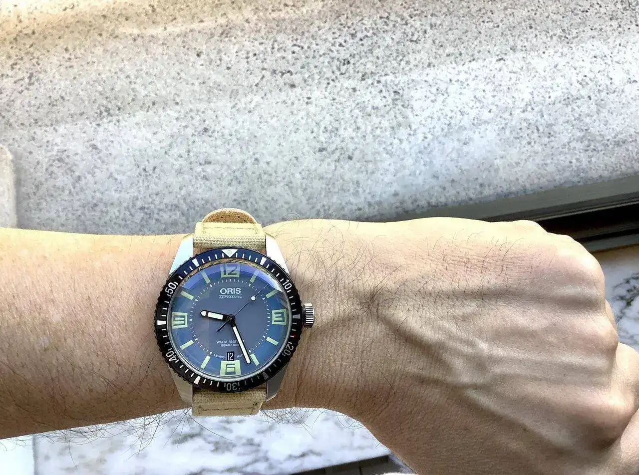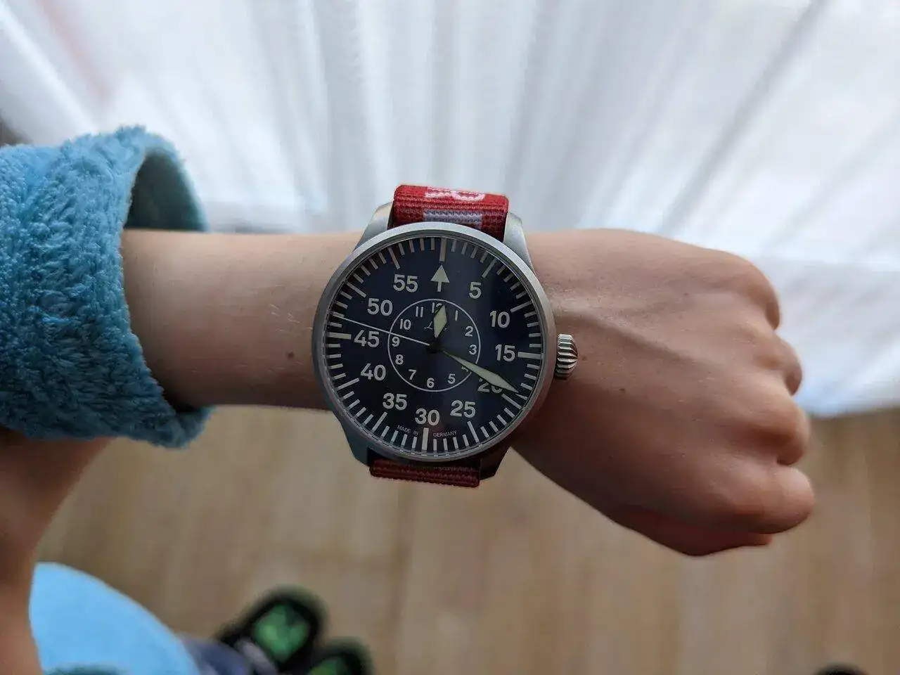 Ha elegido una correa paratrooper que se ajusta a casi cualquier medida y hemos conseguido ponerla a la de su muñeca, así que todo contento que va con el reloj de papá.