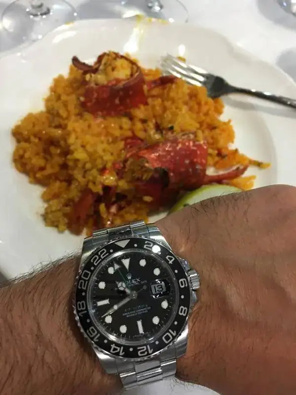 Os pongo unas fotos que hice ayer para postear hoy. Cena en el náutico de Sanxenxo con mi hermano (aficionado light a los relojes). Un arroz con bogavante espectacular.