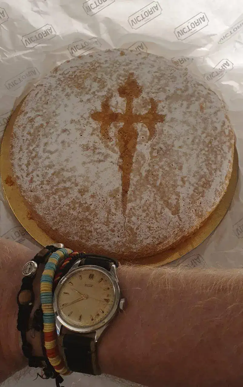 Aquí con mi Tissot calibre 19, revisado y quw va como un jovenzuelo. Y de fondo una tarta de Santiago, traída por una amiga de mi mujer. La voy a disfrutar yo, porque a mi santa no le gusta y los niños son alérgicos a la almendra. Creo que en 4 asaltos, la dejo lista 😋