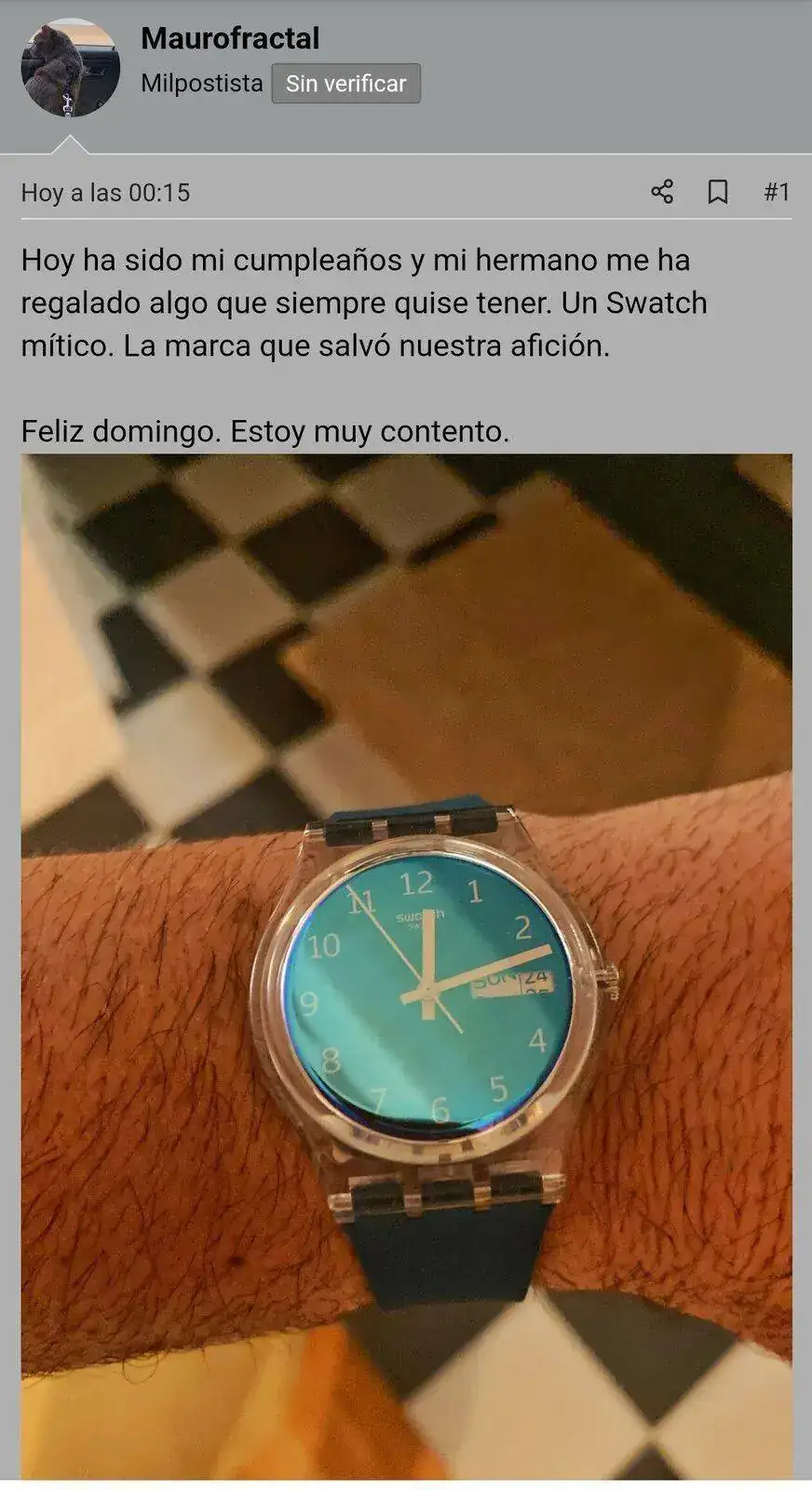 Felicidades! Y enhorabuena. Creo que hay, por algún lugar de casa, un Swatch Black Black, lo buscaré.Hoy ha sido mi cumpleaños y mi hermano me ha regalado algo que siempre quise tener. Un Swatch mítico. La marca que salvó nuestra afición.
