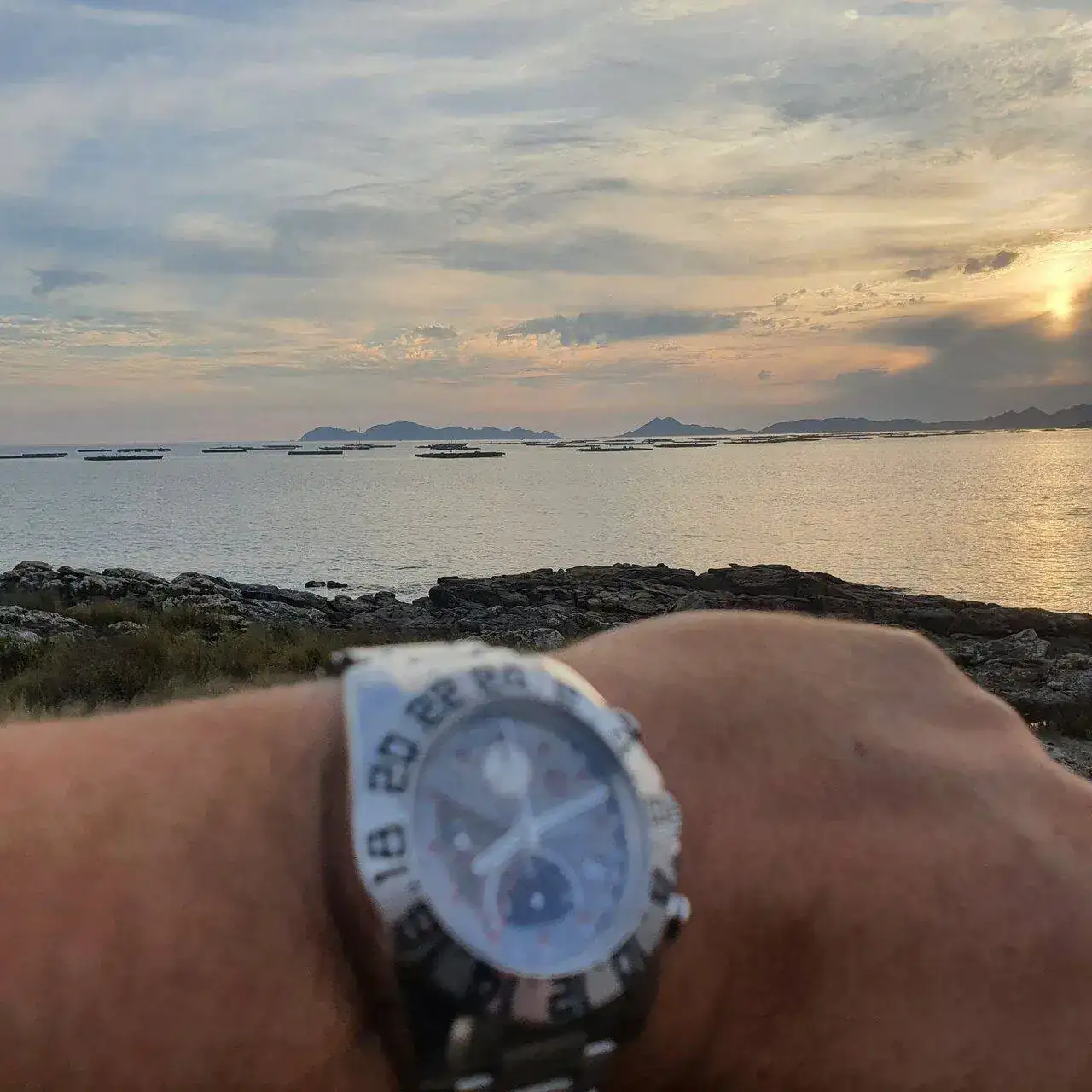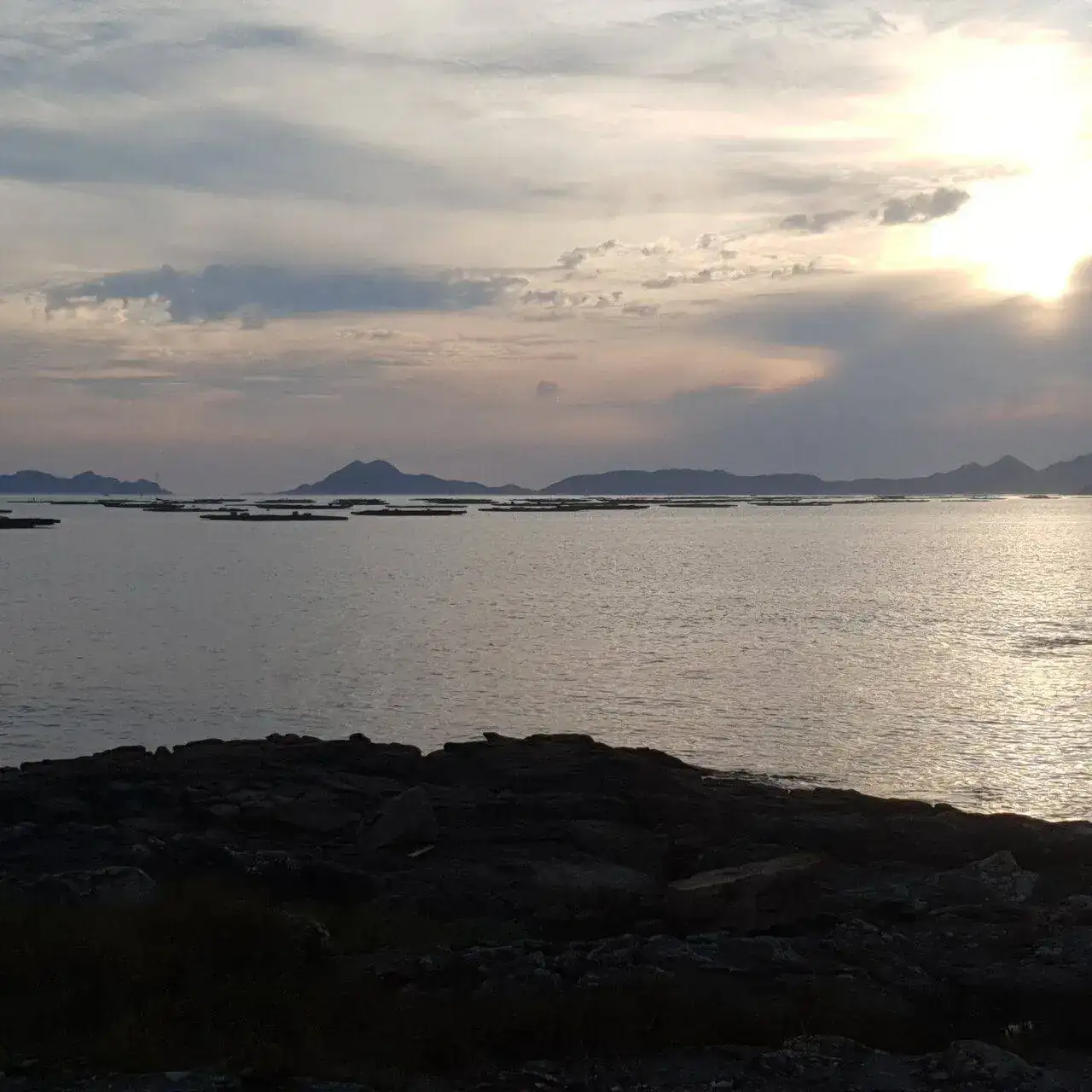Espectacular paisajeAhí tenéis al atardecer, tras un mar de bateas, Las Cíes vistas desde Punta Balea, junto a la fábrica de Massó.