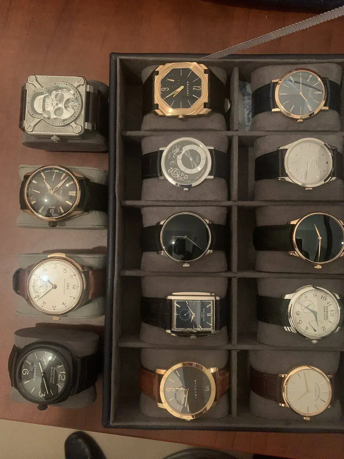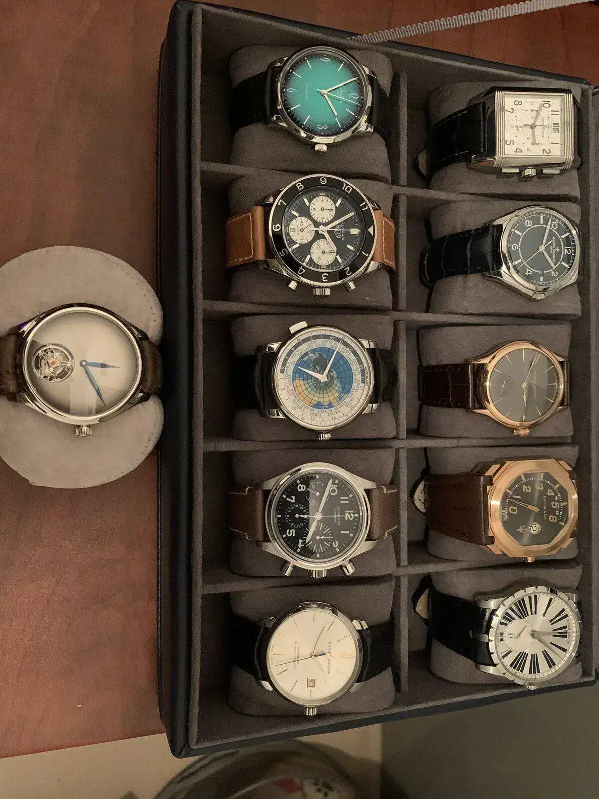 Finalmente traje ayer a casa los relojes y pude hacer las fotos de todos juntos. Hoy mismo los devuelvo a su lugar correspondiente en el banco. Como soy un tipo bastante metódico (muy cuadriculado…) no me cuesta mucho organizarme para poder utilizar cada uno de los relojes varias veces al año. El protocolo que sigo es básicamente mantener unos 6 relojes variados en casa para ir alternándolos a diario (7 si llega en ese período alguno nuevo ó si me devuelven alguno que estuviera en revisión/reparación). El resto de relojes los tengo en el banco (no es lo perfecto pero en mi caso os aseguro no tengo mejor opción). Y más ó menos una vez al mes voy a hacer el cambio y cojo otros 6 para casa.