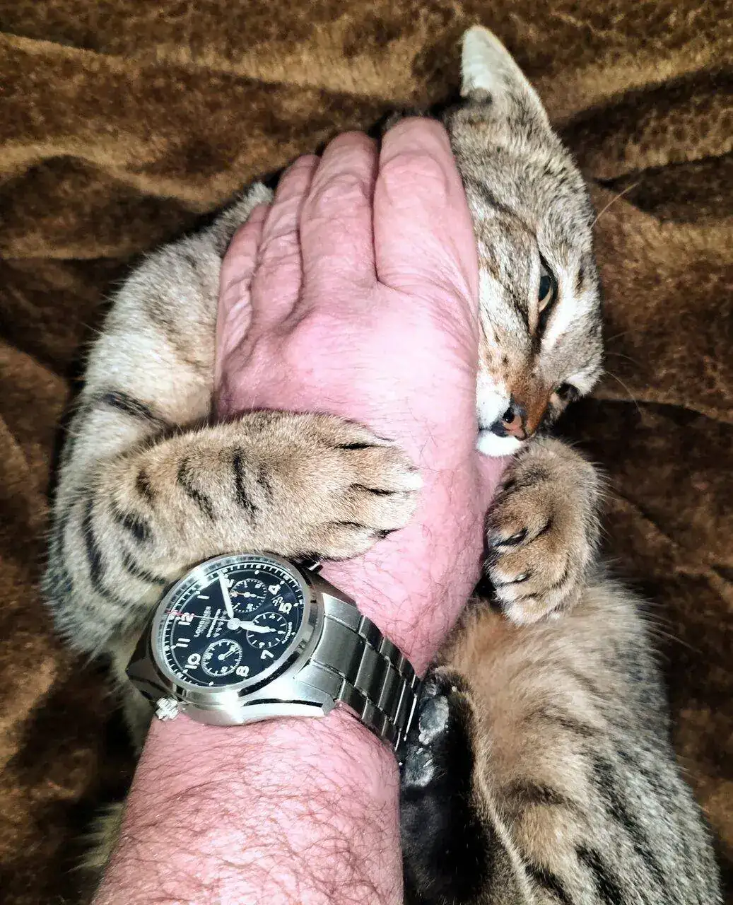No tiene ni sacadas las uñas. Será una bendita.Ya me ha trincado para matarme la criminala esta. Menos mal que lo hace con mucho cariño. Yo también la trinco del pescuezo.