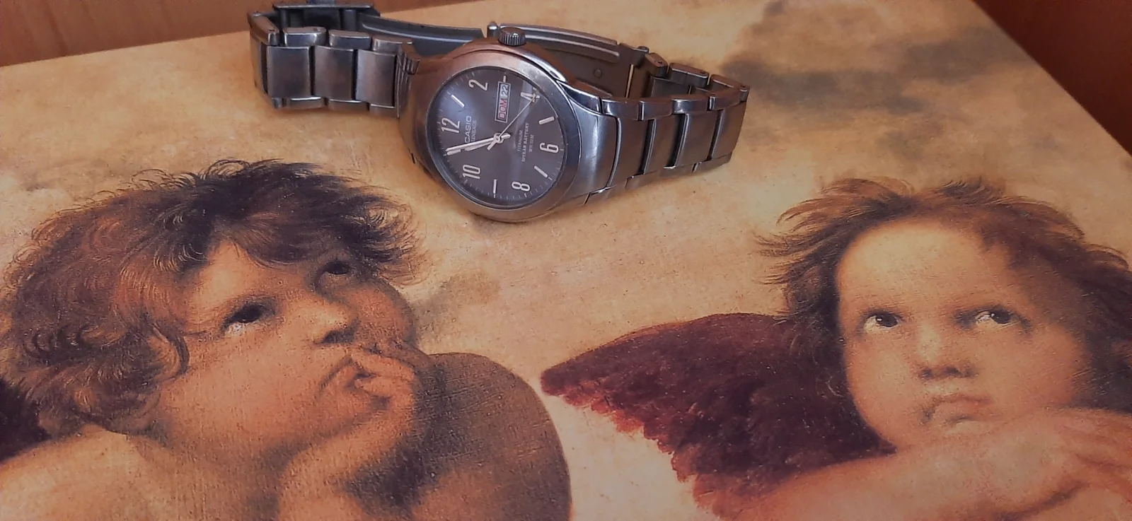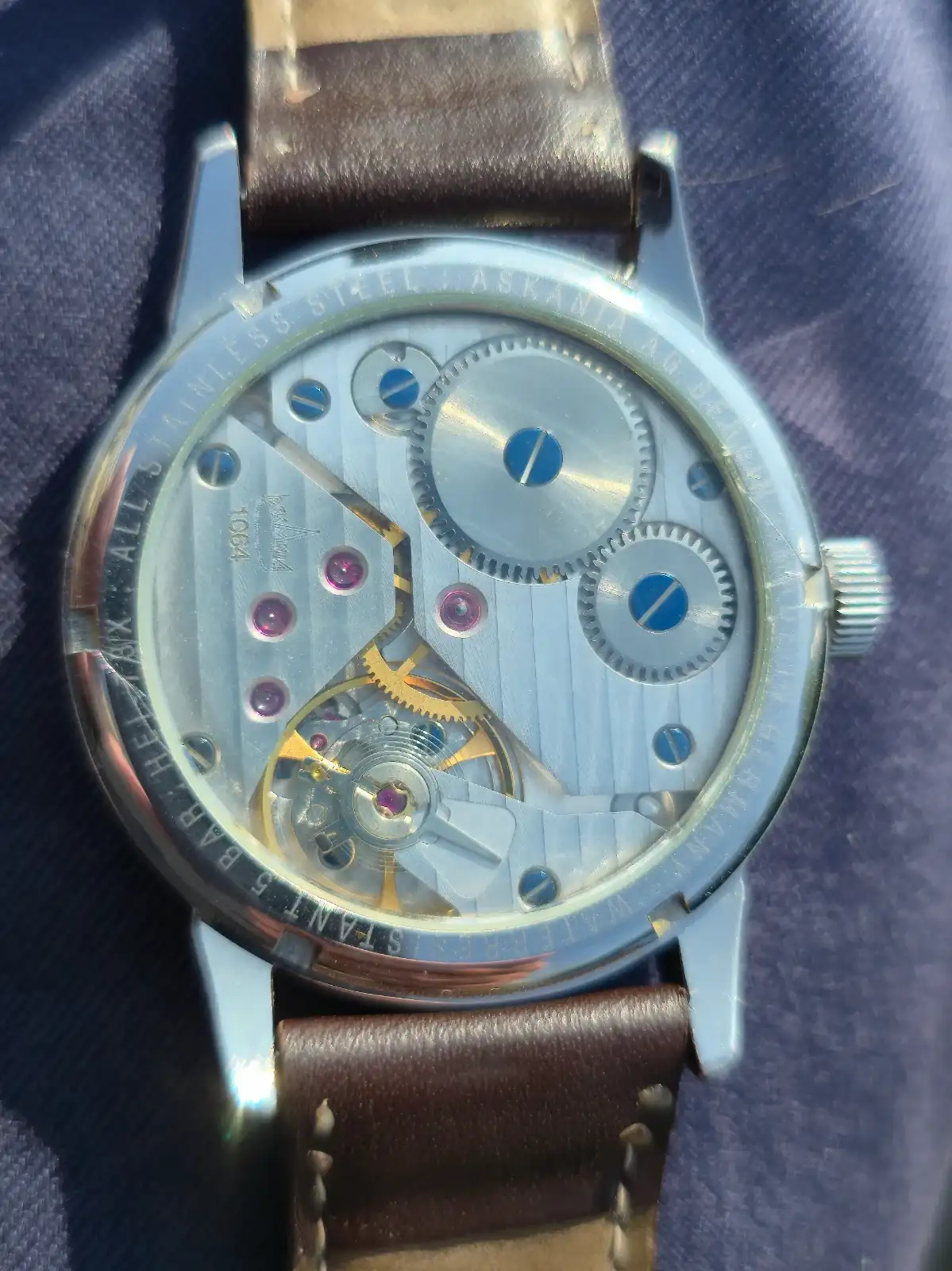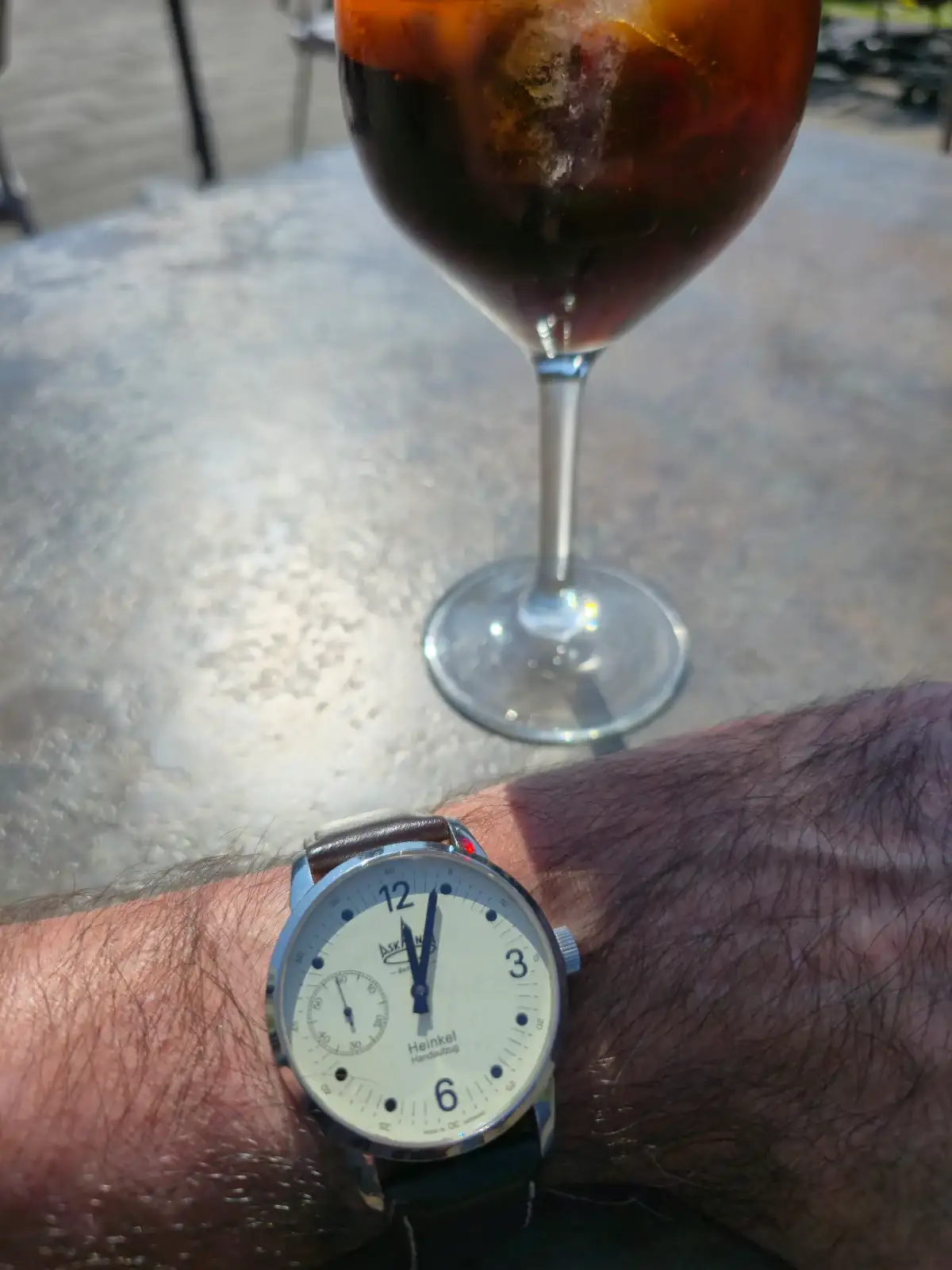 Aquí también de aperitivo, con este Askania Heinkel. Si el Pobeda de ayer medía 33 mm de diámetro, éste tiene 42,5 mm y, al no tener casi bisel, se me hace enorme. El "marianito preparao" esta vez sin Campari, que se les había terminado.