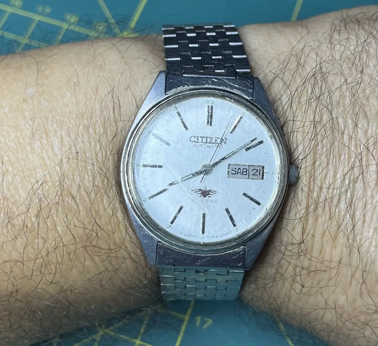 Citizen Eagle 71-1977. Como todos los sábados, hoy he estado en el mercachuflo. Me he traído 10 relojes por 60 euros. De los 10, uno ha ido a la basura, 5 están en wallapop porque no me gustan, 2 están a la espera de recibir las correspondientes pilas para probarlos (un Piratron y un Kessel, lo se, pero a mi me gustan porque el kessel es igual al que tuve de preadolescente y el Piratron me parece muy cachondo el nombre y el logo) y dos que están funcionando. Un Pulsar digital de principios de los ochenta o finales de los setenta y este que les muestro. Un Citizen automático con el que he aprendido a ajustar el volante pues, adelantaba mucho y no lo solucionaba con el desmagnetizador. Con un palillo de madera he movido un par de milímetros o tres la palanquita del volante y ahora ya va en hora, con mi móvil, desde hace unas 8 horas. Tenía más mierda que el palo de un gallinero. Lo he limpiado, junta nueva y armis ajustado. Cuando aprenda a cambiar los plexis y tenga las herramientas adecuadas, se lo cambiaré y otro "pa la saka". Todo lo que ven rayado está en el plexi. La esfera está perfecta. Un saludo y muchas gracias.