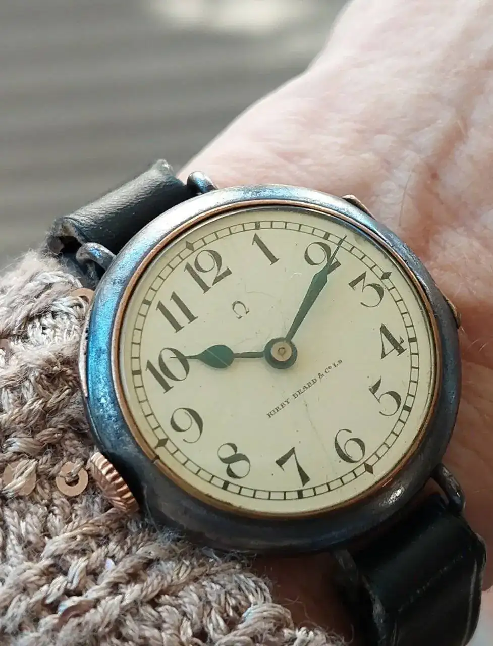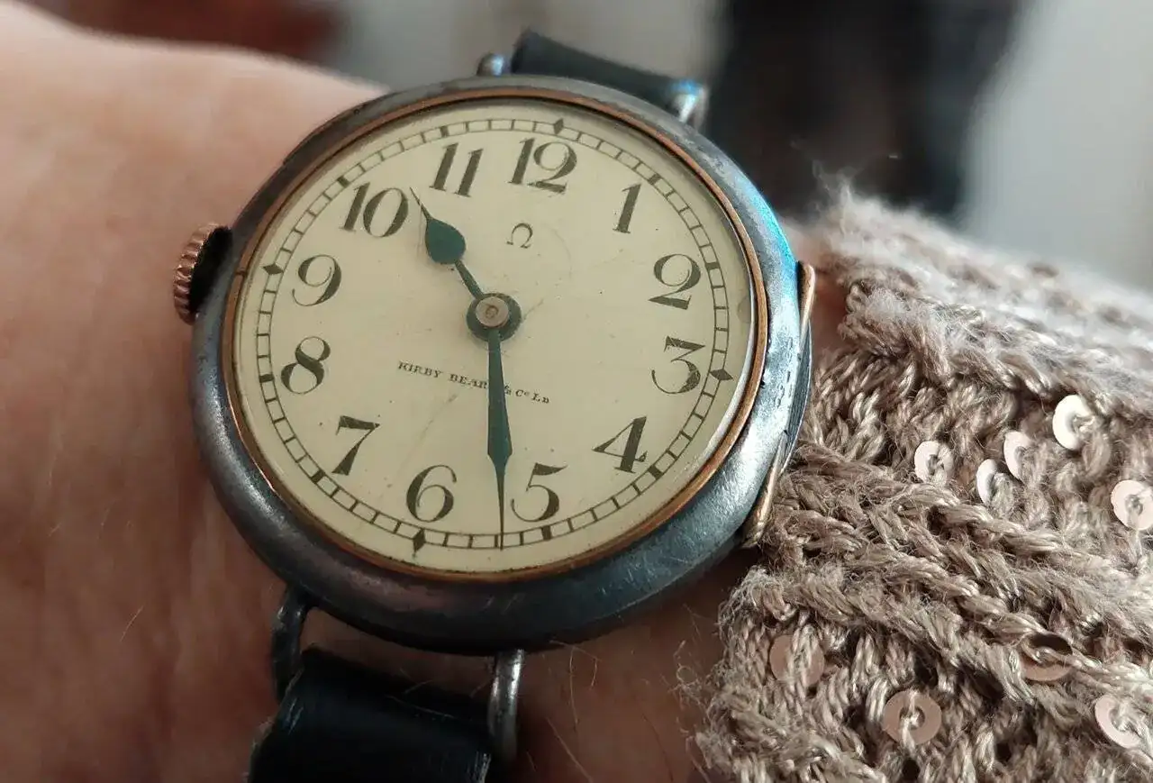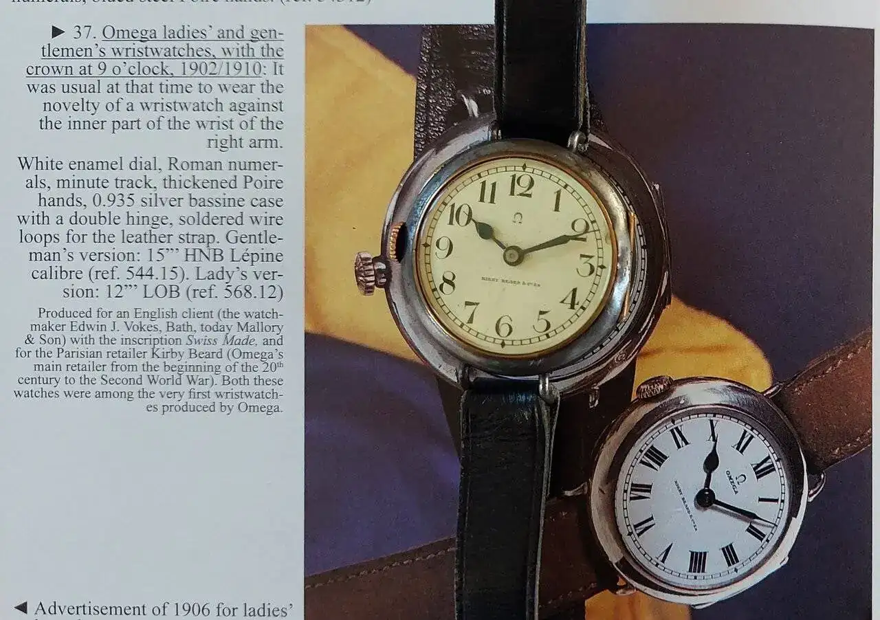 Primeros relojes de pulsera Omega para zurdos, sin segundero, 35mm, calibre 15lineas, esfera esmaltada, caja gum metal con dos tapas y pestaña, agujas de Pera bruñidas...