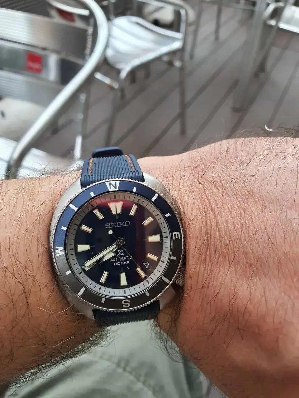 Buenos dÃas compañero, yo tengo el mismo pero en negro, si no me equicoco, esa correa no es la original, donde la has comprado? Gracias. El reloj es una maravilla, súper contento con él. Saludos.Que tengais tod@s un feliz domingo
