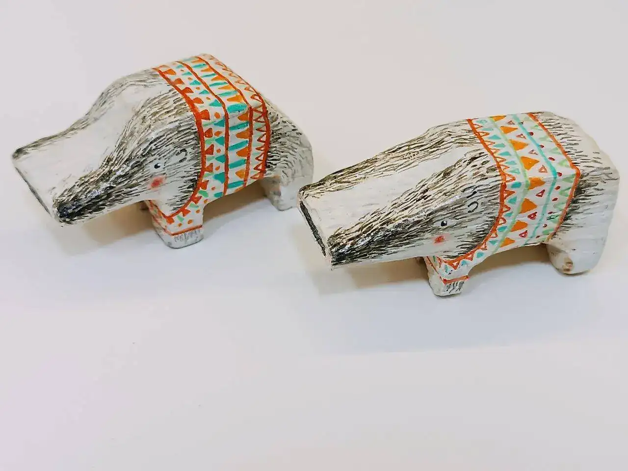 ¡Hola, compañero! Fueron el regalo de una amiga, como dices son de madera y los talló y pintó ella misma. Son dos tejones vestidos con un jersey... Seguro que se imaginó una historia para ellos, es una artista.
