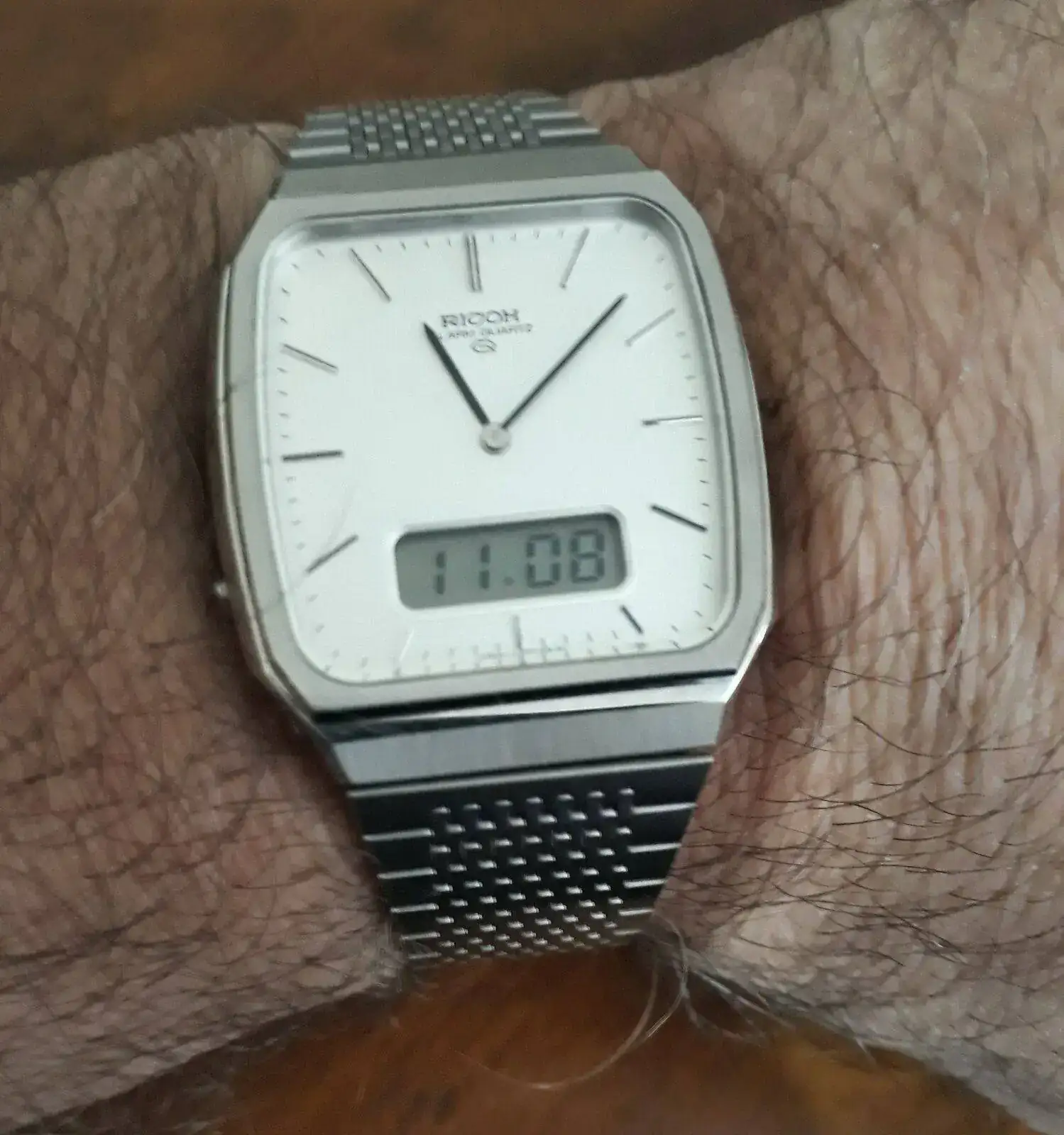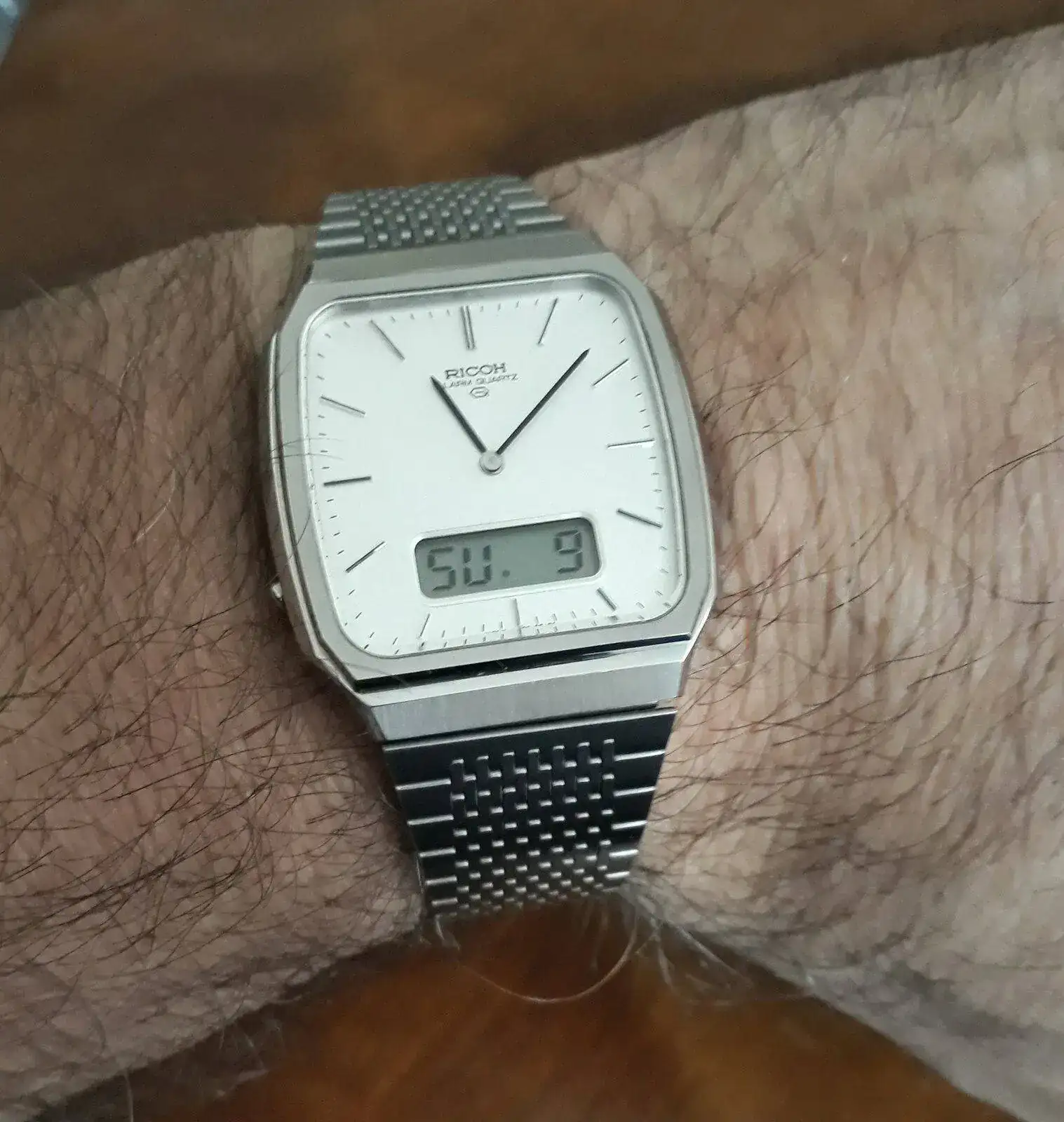 Feliz domingo para todos hoy disfrutando un Ricoh quartz ana-digi alarm autentico made in Japan del '81 en impecable estado (n.o.s.),este modelo solo tiene hora dual y alarma ademas de fecha completa. Lo compre hace unos años a una vieja relojería que era agente oficial de Ricoh watch co. Que cerro hacia años este modelo era nuevo sin uso desde los años '80s. Me di el gusto de estrenar un vintage.