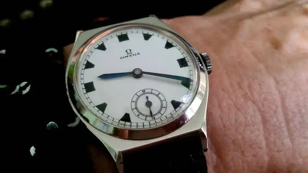 Preciosa pieza, de museoBuenos días, lluviosos y caseros.....En la muñeca un Omega de los años 30Con preciosa esfera de porcelana