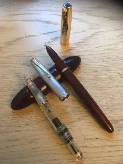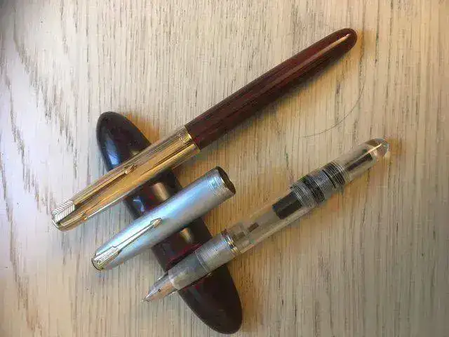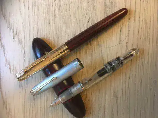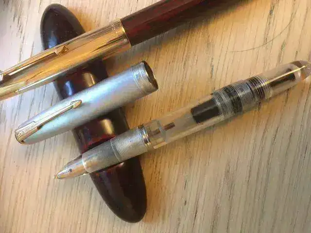 La primera es una vacumatic de 1942, originalmente gris paloma con capuchón de plata. Fue tuneada con un cuerpo, boquilla y tapa de Ariel Kullock. Todo lo demás es original: es increíble cómo hacía este experto argentino sus piezas, que encajaban en los originales como si fueran de fábrica.