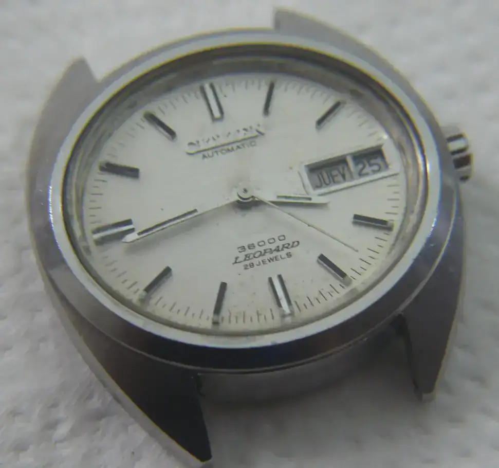 En todo caso, esta carencia se solucionó en la segunda generación del Leopard, la que lleva la corona a las 4. El pase rápido de día y fecha se hacía de la siguiente manera: si se apretaba la corona con el reloj de frente (esfera a la vista), se cambiaba el día, y si se hacía con el reloj vuelto ((tapa a la vista), se cambiaba la fecha). Me parece un sistema ingenioso y si alguien lee esto y tiene un Leopard de ese estilo, estaría bien leer su experiencia con ese método. Pero repito que al mío solo puede cambiársele rápidamente la fecha, no el día, extrayendo para ello la corona a la primera posición, como en el Cutlass.