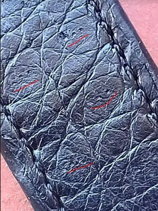 El cuero luego tiene los tipicos grupos de raices de las cerdas, siempre tres en una linea. El tacto del cuero es extremamente suave, algo esponjoso. Dificil explicarlo con palabras como se toca.