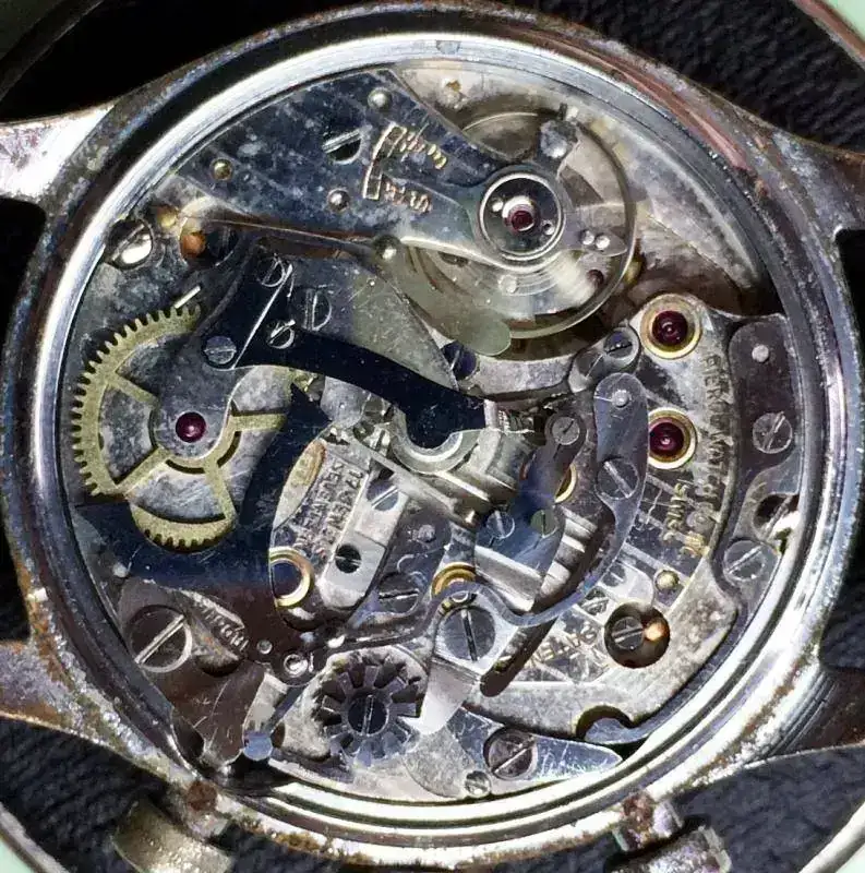 No hay muchos supervivientes con este primigenio calibre cronográfico 130 que hayan llegado sanos y salvos hasta actualidad. En cambio, del 134, su sucesor con dos pulsadores, han sobrevivido más ejemplares, y para muestra mi botón