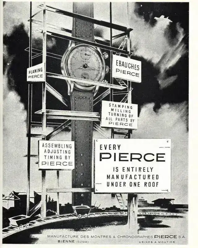Los hermanos Lévi crearon en 1883 “Léon Lévy Frères Manufactures des Montres et Chronographes Pierce SA” en Bienne (o Biel, si preferís el alemán) y la empresa fue cobrando importancia hasta convertirse en un agente importante del sector para 1910. En los años 20 fueron tanteados/tentados por Ebauches S.A., para que se uniesen al consorcio, pero la idea que tenía Léon respecto al futuro de su marca era muy diferente, así que rechazaron la oferta y se mantuvieron independientes. El coste de esa independencia fue que todos los proveedores les dieron la espalda, lo cual obligó a la empresa a idear y desarrollar sus propios calibres. Fruto de ello, Pierce inventó más de 30 calibres diferentes a lo largo de su historia, y lo llevaba a gala
