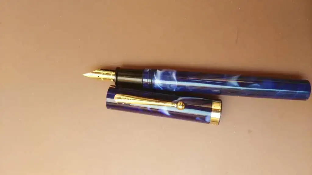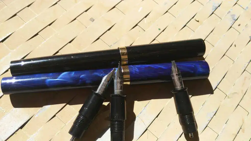 Buenas tardes. Pongo a la venta por no usarlas estas dos piezas sobradamente conocidas, una negra con adornos dorados y otra azul marmolizado, ambas en punto M y en excelente estado. Se acompaña un convertidor y un juego de plumines italic punto f, m y b para "jugar " con ellas.