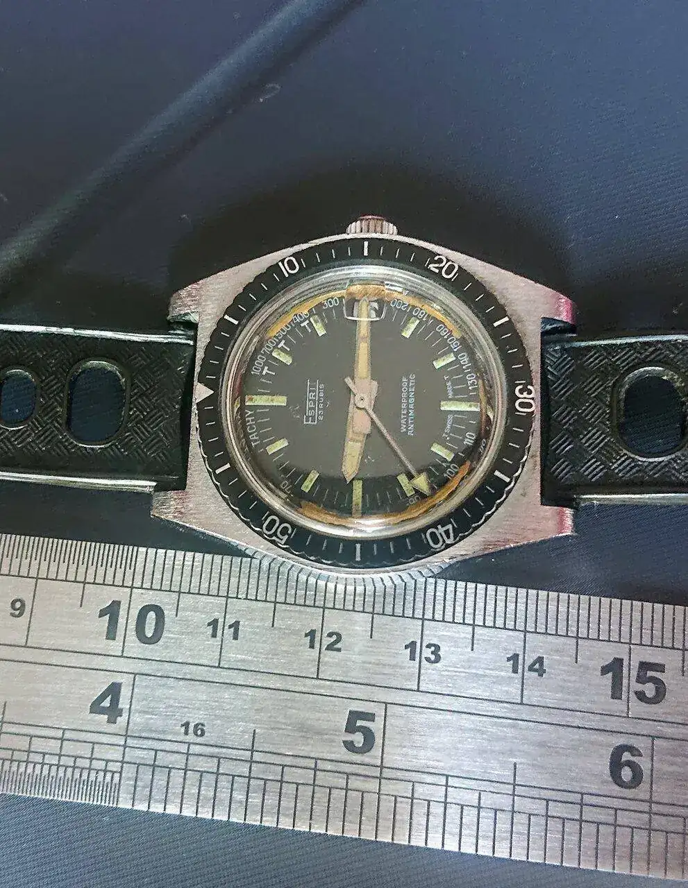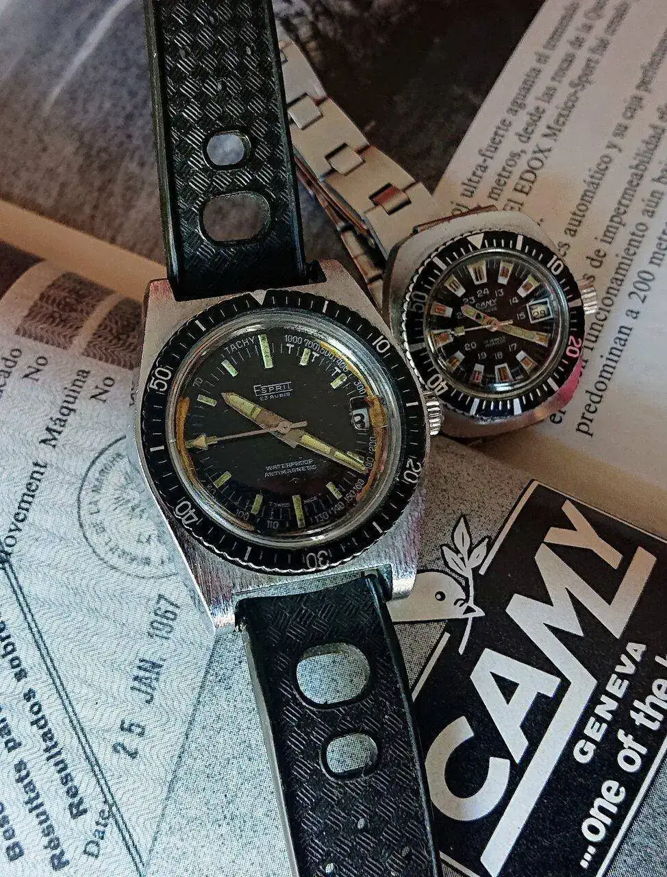 Bueeeeno pues ese gusto por los diver, entre otras cosas, lo comparto con mi bienquerido Marcel, que ha tenido a bien confiar a mi muñeca el disfrute de estos dos bombones. Ambos preciosos y con detalles fantástics: el Camy con un brillo en los índices y una rueda interior para facilitar la lectura de las segundas doce horas del día, y el Esprit con unas agujas que me rechiflan y una curiosa escala taquimétrica en el perímetro exterior, muy inusual en divers. Dos sorpresas realmente deliciosas de las que ya he empezado a disfrutar
