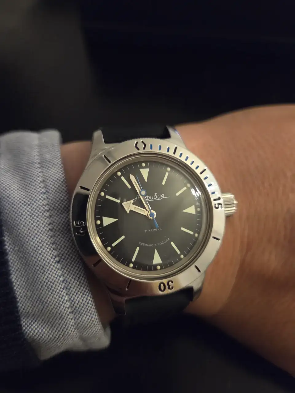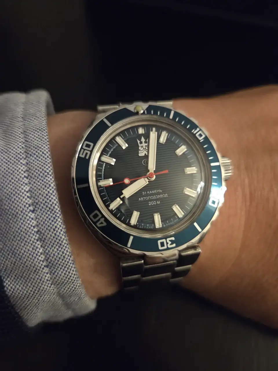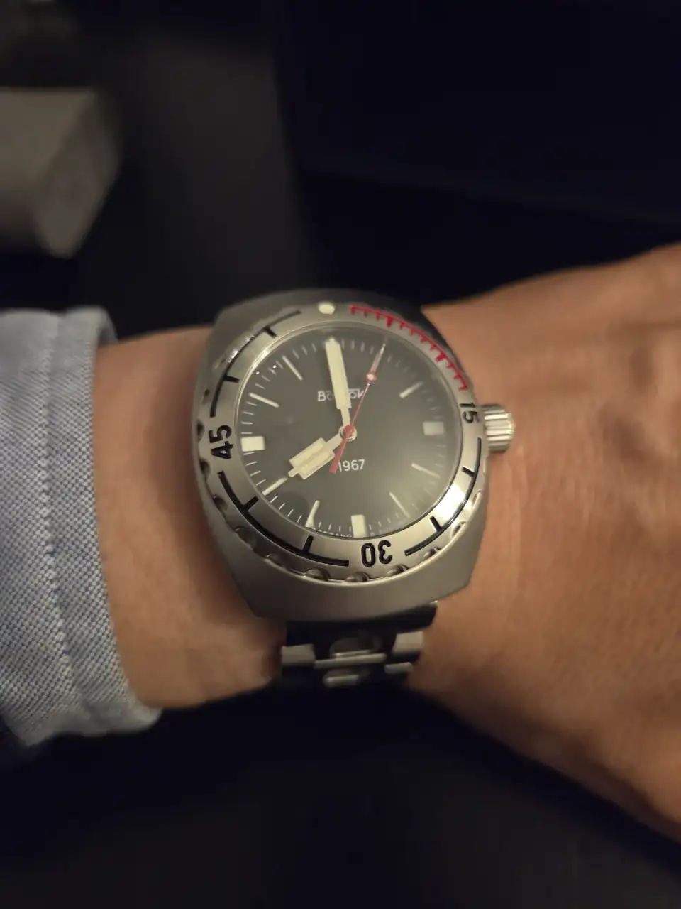 Vostok Amphibia 1967. Es la edición con bisel unidireccional, zafiro, buen lumen y un brazalete que me encanta. Es el último en llegar y, a no ser que se me cruce algún vostok del foro, el último vostok que entrará en la caja. Lo veo un relojazo.