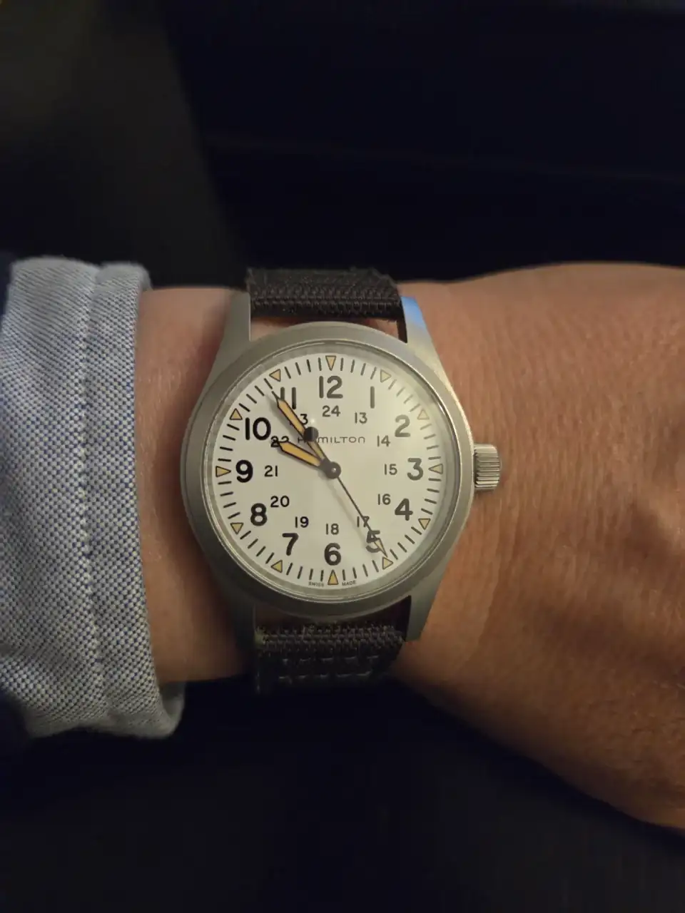 Hamilton khaki field mecánico. Otro clásico. Mi límite son los 38mm, menos lo veo pequeño. Y el khaki lo veía muy justo el de 38mm...luego sacaron el de 42mm y era muy grande...pero este de esfera blanca en 38mm me lo veo bien.