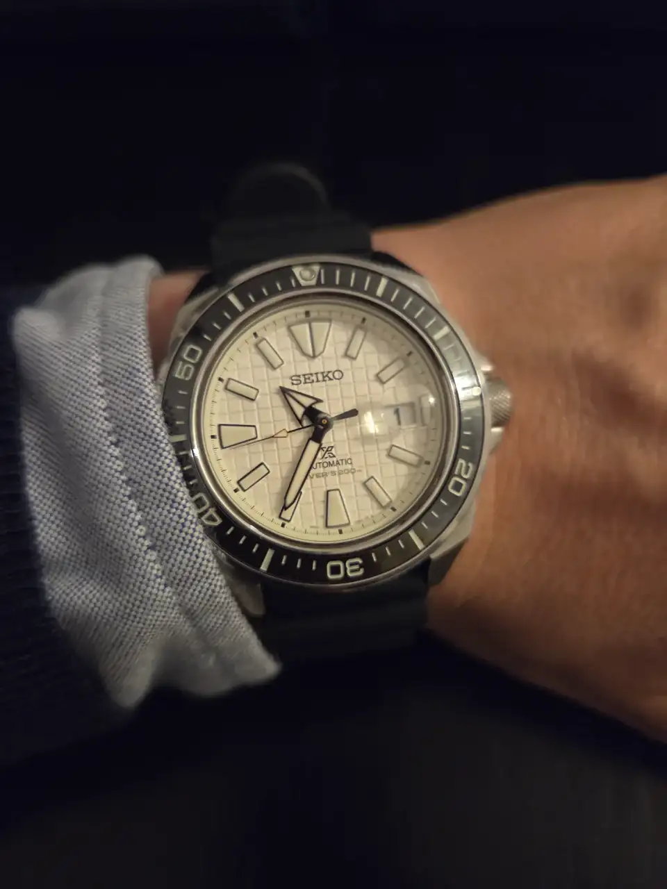 Seiko King Samurai dial blanco.El siguiente lo descubrí buscando divers asequibles con esfera blanca, hay realmente pocos y este fue el elegido. También cedido por otro compañero, en estado de reestreno. No me gustan mucho los cauchos y estoy en búsqueda de su armis.