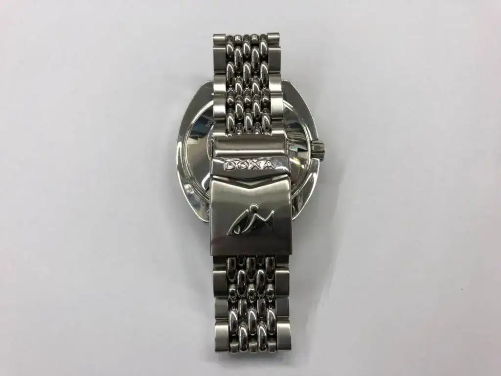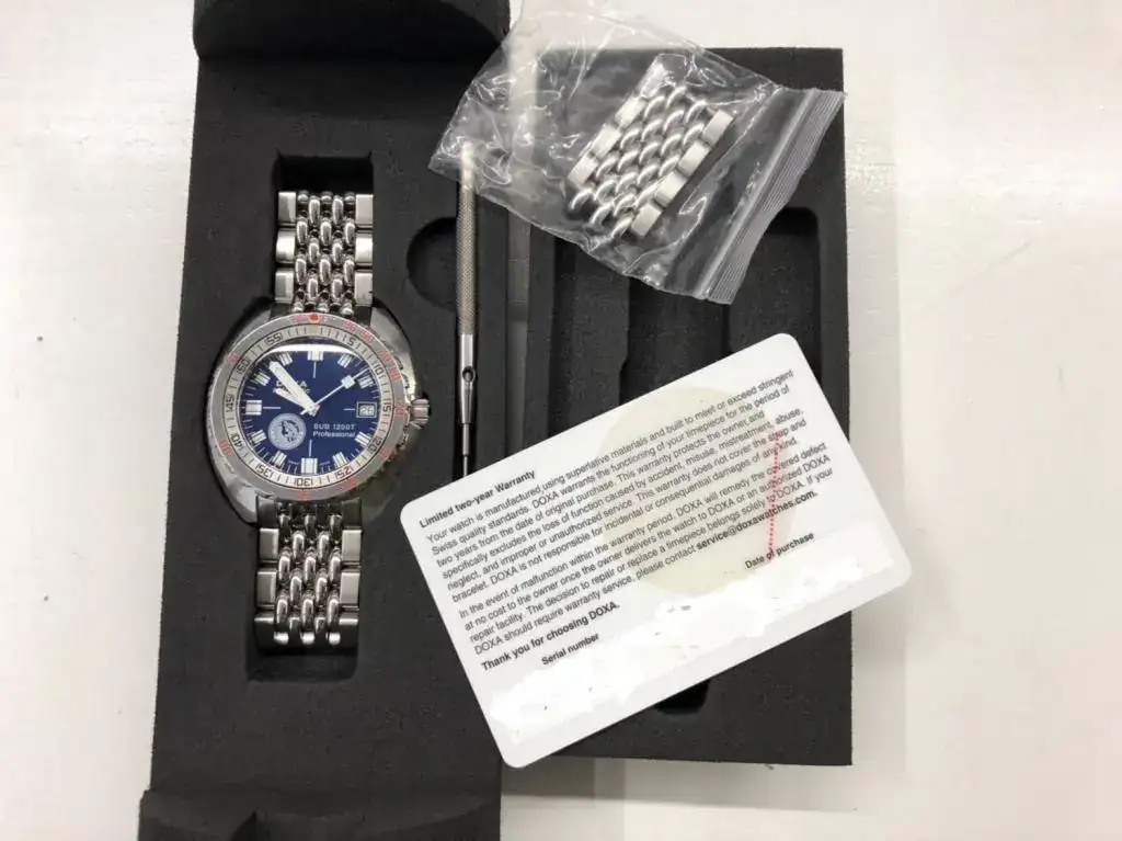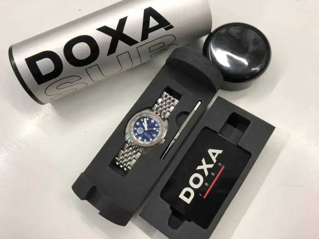 Lleva el kit completo: el tubo de Doxa, tarjeta de garantía rellenada, eslabones sobrantes y destornillador.