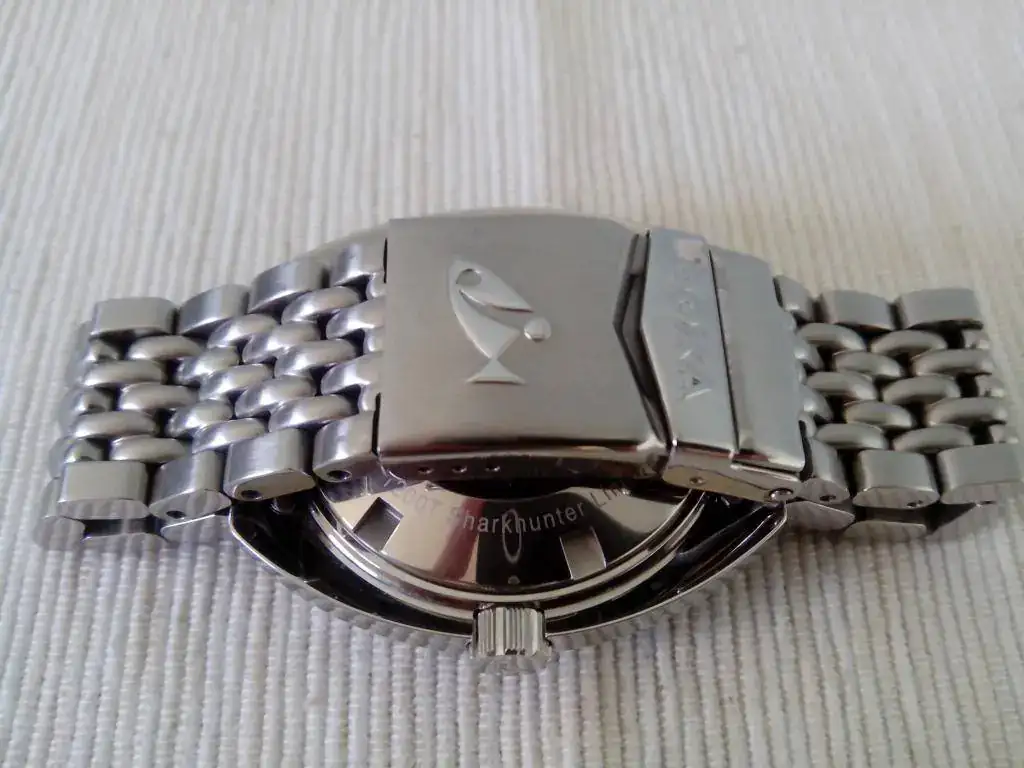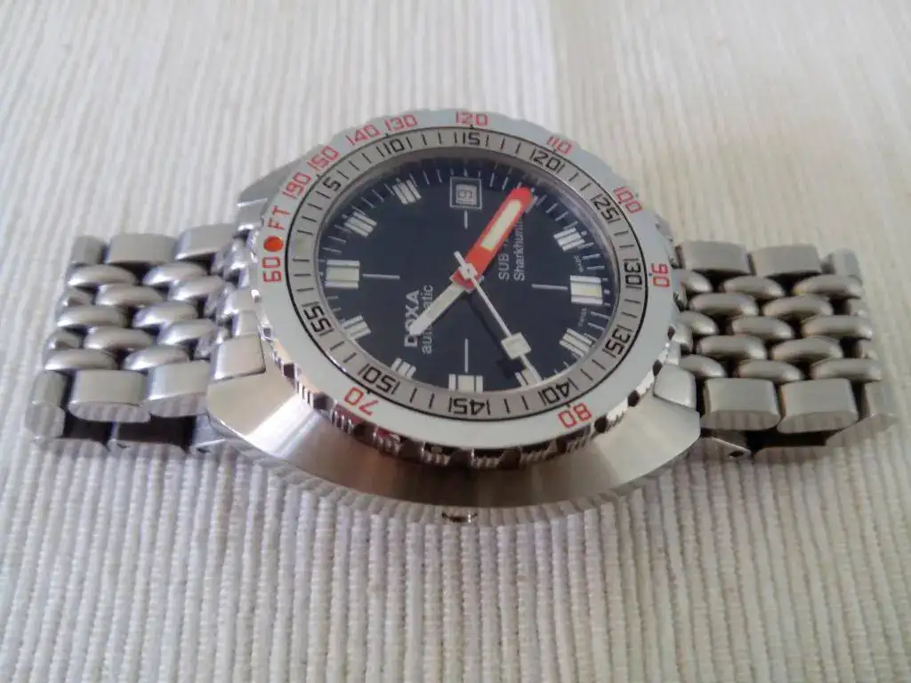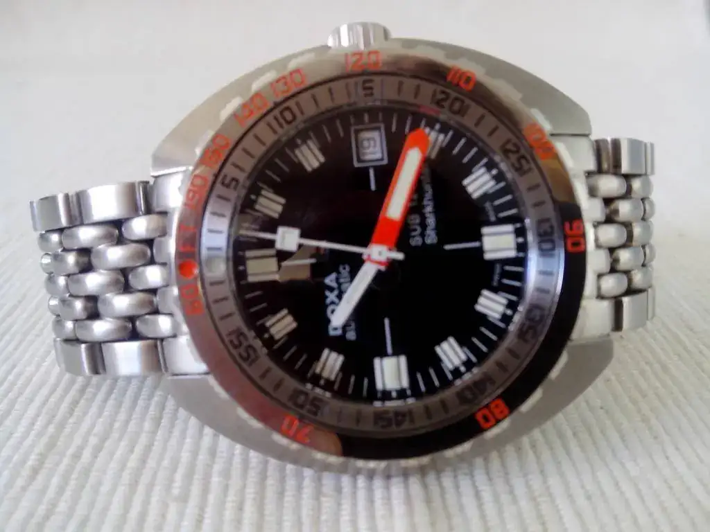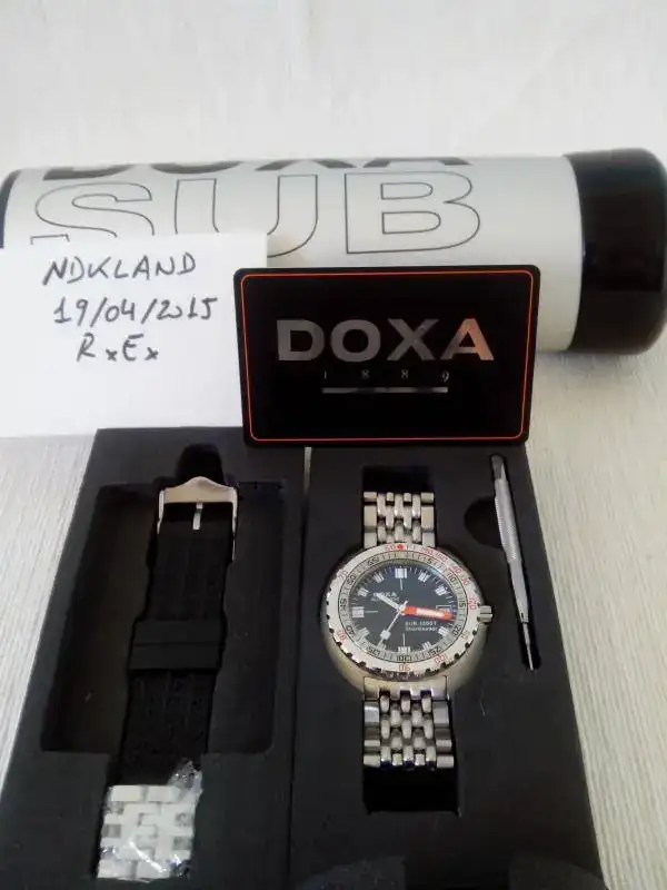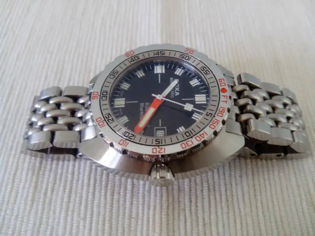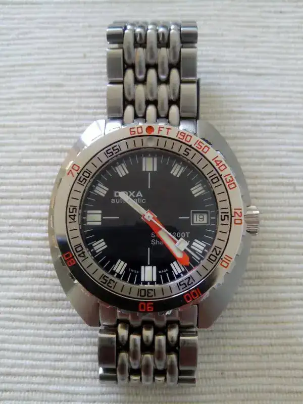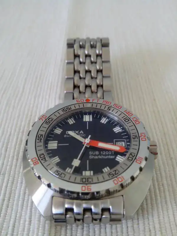 Saco a la venta este DOXA 1200t SHARKHUNTER. El reloj se encuentra en un estado muy bueno. Por ser un poco escrupuloso diria que 9 sobre 10. Tiene dos micro pelillos en la zona pulida del bisel y alguno mas en la zona de las asas debido al cambio de correas. Son minimos y con el reloj puesto hay buscarlos e inclinar el reloj para que segun como le de la luz, se vean. Pero estar, estan.