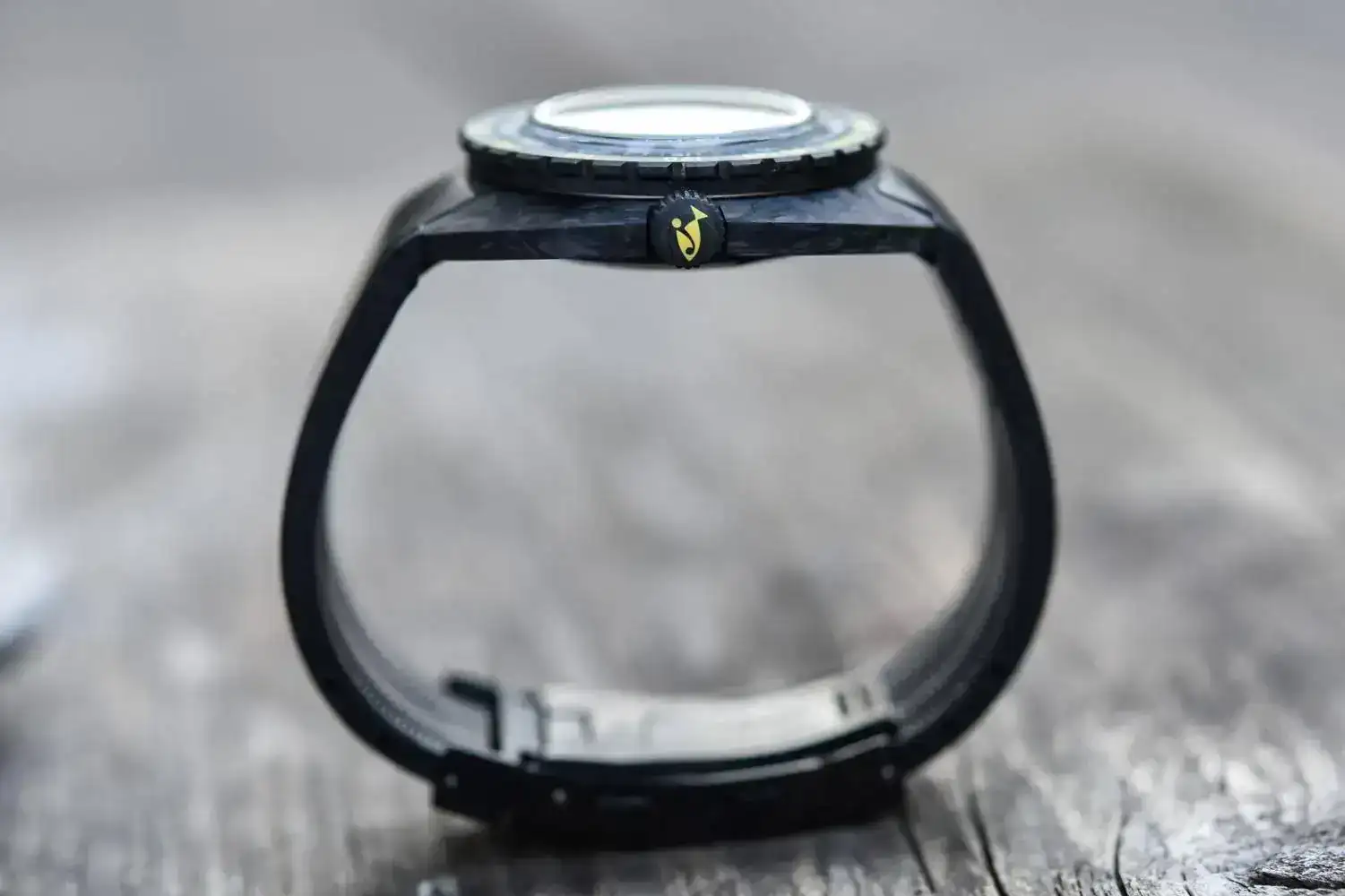 El bisel giratorio unidireccional, también ejecutado en carbono forjado, todavía presenta la tabla de buceo sin descompresión de la marina estadounidense con indicación de profundidad en amarillo y graduación de tiempo en blanco.