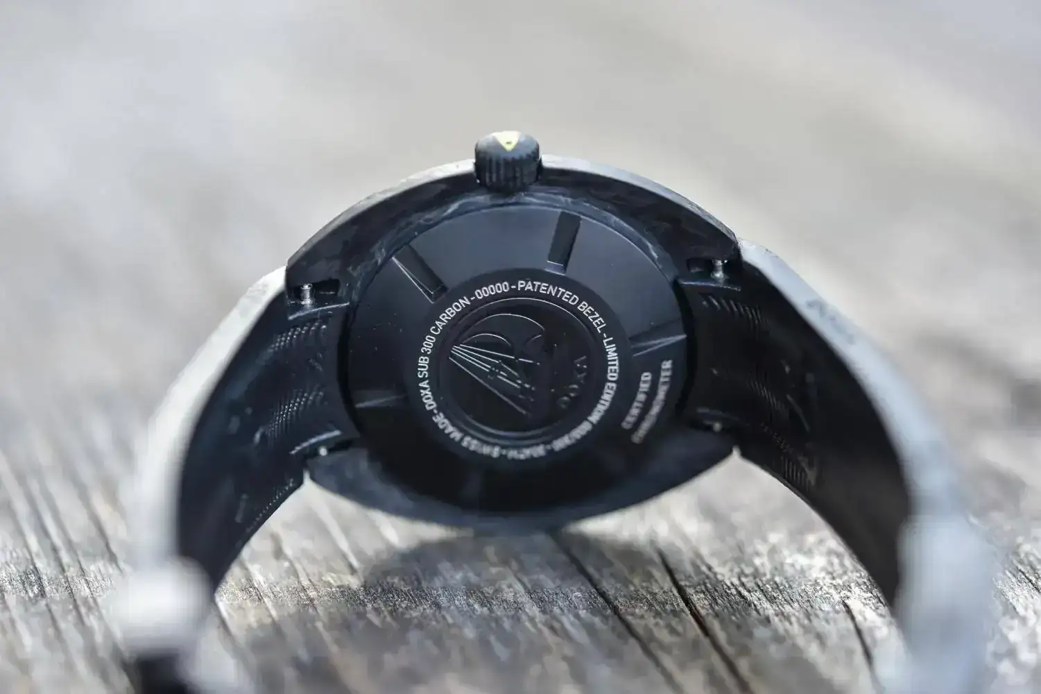 El borde dentado permite un agarre óptimo incluso con guantes. El logotipo de Aqua Lung US Divers está impreso en la esfera de carbono a las 7:30, gracias al nuevo acuerdo de asociación Doxa -Aqua Lung, con sede cerca de Niza en Francia, compañía todavía activa en la producción de equipos de buceo.