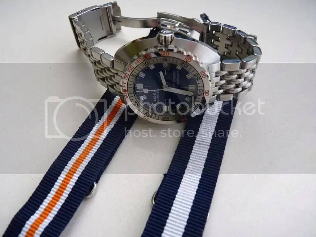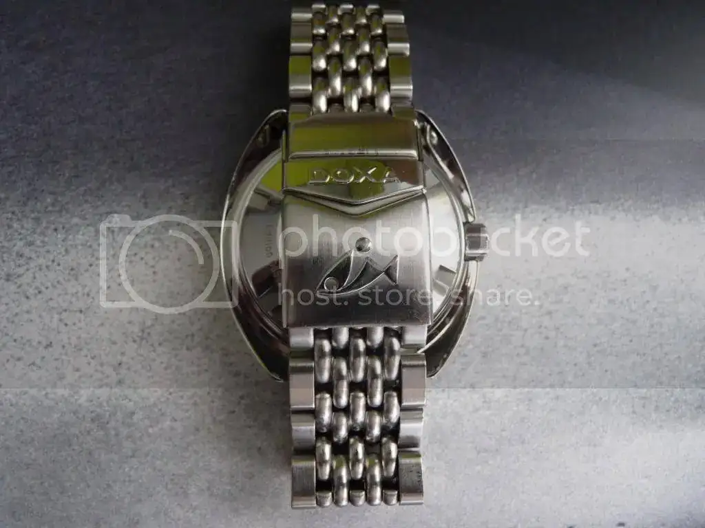 Brazalete de acero (grano de arroz) característico de Doxa, con extensión de buceo