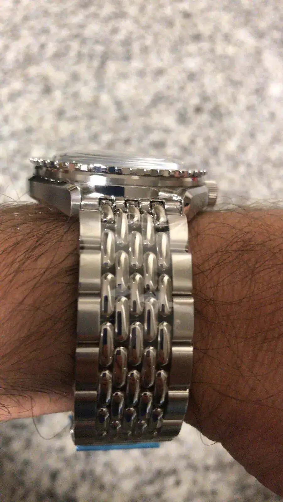 El reloj simplemente es “delicioso”, buena factura general, esfera bastante minimalista y poco cargada, el brazalete un autentico beads of rice con eslabones individuales y el cierre, lo más flojito, de calidad de chapa estampada. La carrura del reloj, bisel, zafiro de bisel-índices-agujas con un luminova ligeramente tostado... en general un reloj muy bien fabricado y PRECIOSO, y que zafiro... parece un Plexy y con su antireflejos interior.