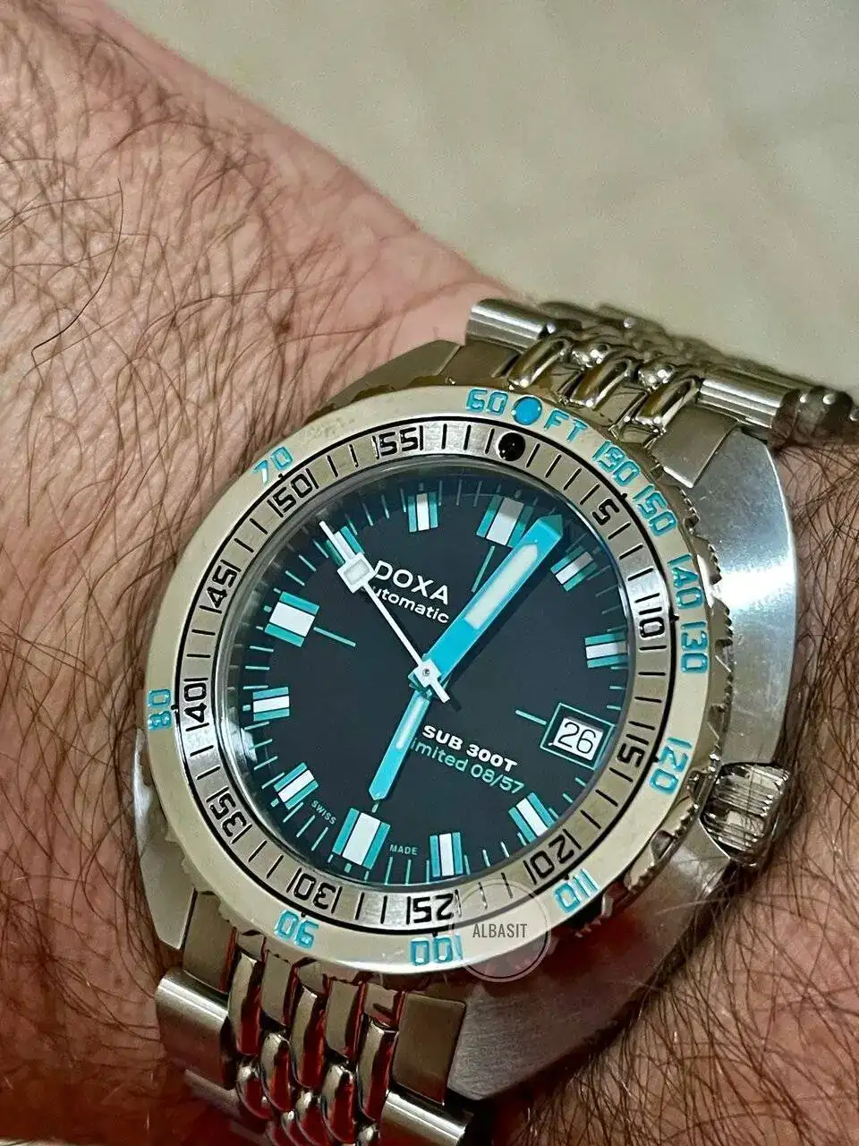 Y aqui ya lo podeis ver mejor , este precioso Doxa con dial negro y agujas e indices color turquesa , al igual que el el insert exterior del bisel.