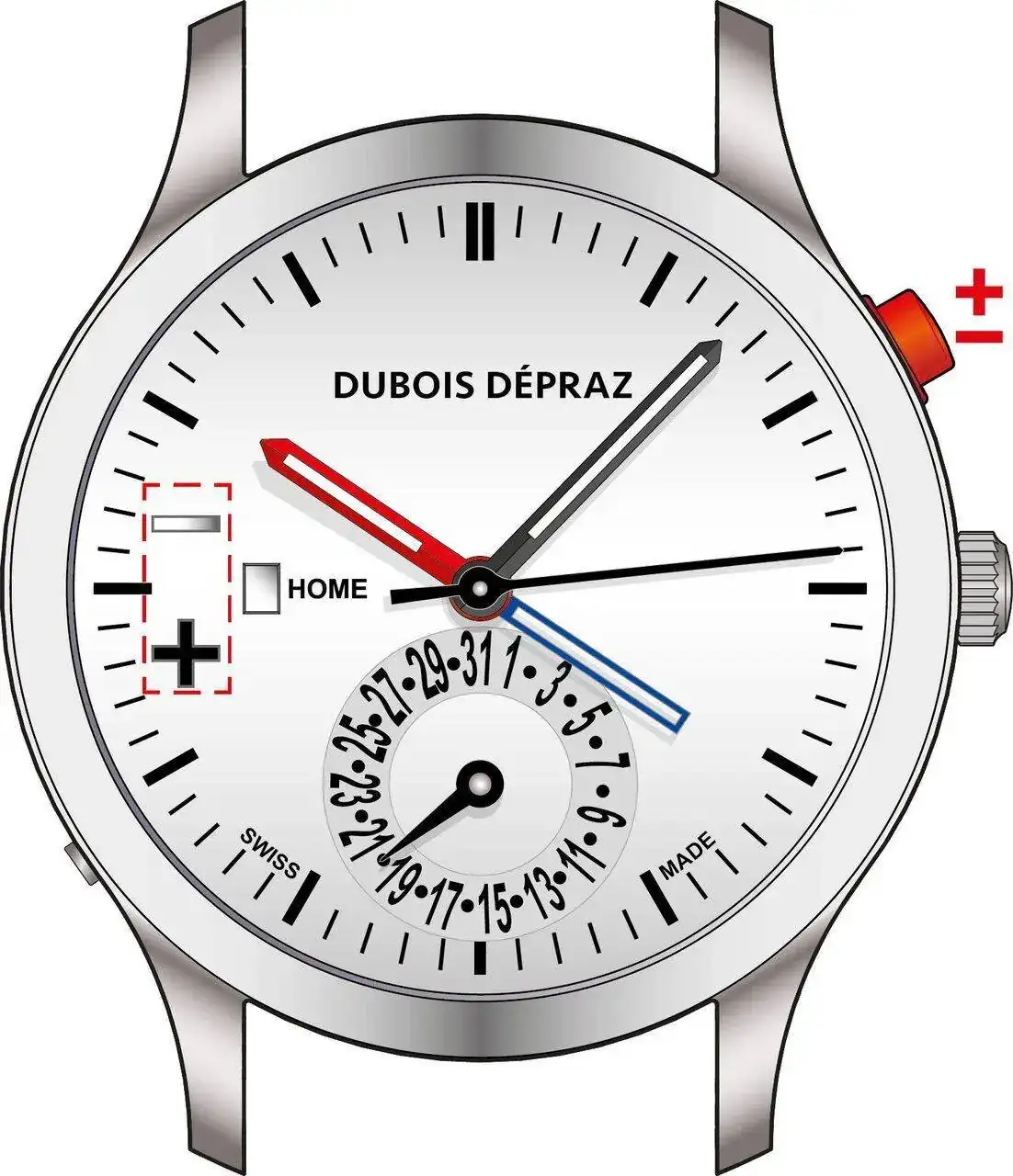 Pero lo que lo trae aquí es otra: una función GMT o segundo huso horario que se puede accionar hacia adelante o hacia atrás con una simple sacudida de la muñeca: esta acción -supongo que por inercia de algún pequeño contrapeso, de ahí lo de "Gravity" en el nombre- hace que al accionar el único pulsador la aguja "home" (la de casa), que suele estar oculta bajo la horaria cuando el usuario no viaja, vaya hacia adelante o hacia atrás según el símbolo + ó - que quede visible en la esfera.