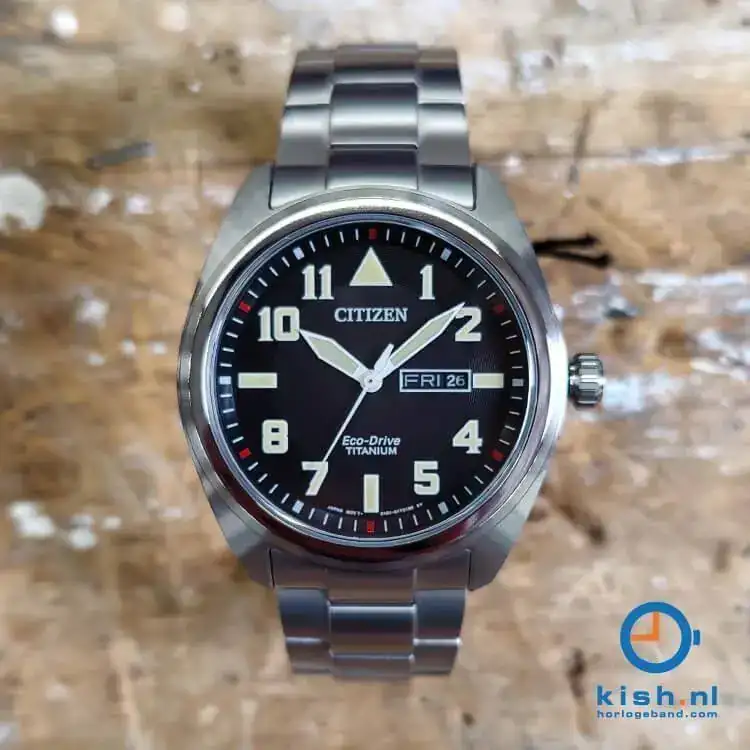 Caja y armis de titanio, muy ligero, cuarzo Eco Drive con carga solar y cristal de zafiro, dial tipo "field"