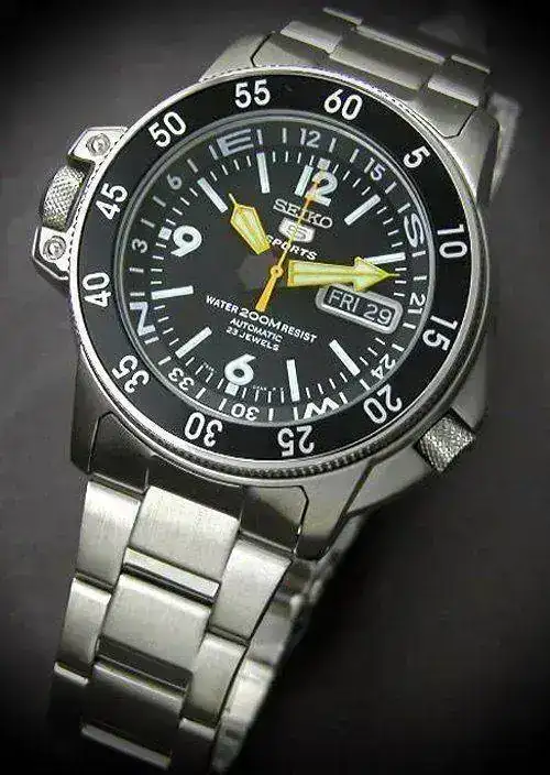 El conocido Seiko Atlas SKZ211K1. Movimiento automático calibre calibre 7S36 (23 jewels). Diámetro 40 mm ( sin corona). 200m. Cristal Hardlex. Precio unos 150 Euros.