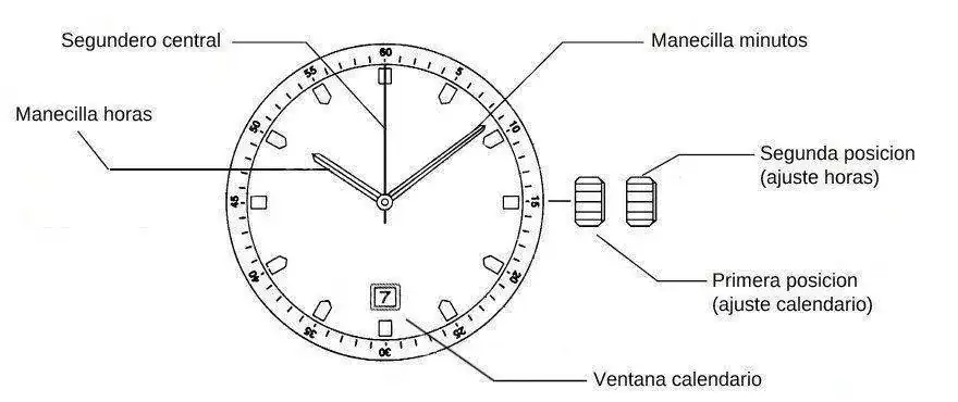 La corona tiene dos posiciones. La primera de ellas (sacando la corona hasta el primer tope) te permite cambiar la fecha, girando la corona hacia ti. Sacándola un poco más, hasta el segundo tope, te permite cambiar la hora.