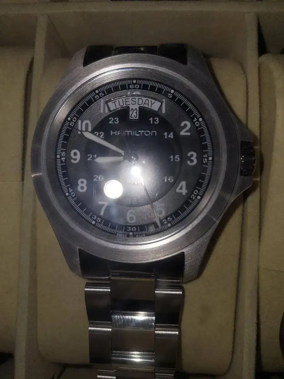 La duda que me surge está en su tapa trasera. Ya que en el mío, no se indica que el cristal es de zafiro, en cambio he visto por internet ese modelo con otras inscripciones en la tapa incluido lo del cristal de zafiro. Eso es normal? Tendrá que ver con el año de fabricación? Os adjunto una foto del mío dentro de mi caja de relojes. Otra de un hamilton khaki field king igual que el mío respecto la tapa trasera y otra con otro hamilton khaki field king que viene con las inscripciones del cristal de zafiro.