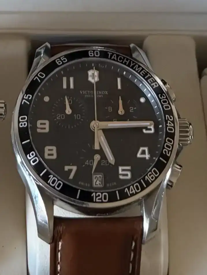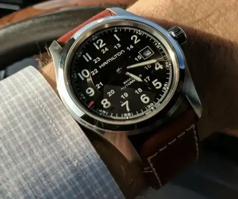 - Pasando por una tienda me enamoré de un Khaki Field en negro con la correa en marrón. Me encanta la combinación de colores y el estilo "militar". Dado mi interés en el reloj y para quitarme el mono adquirí una correa marrón de piel que le puse a mi Victonirox Chrono Classic (el cual siempre había llevado con su armys original).