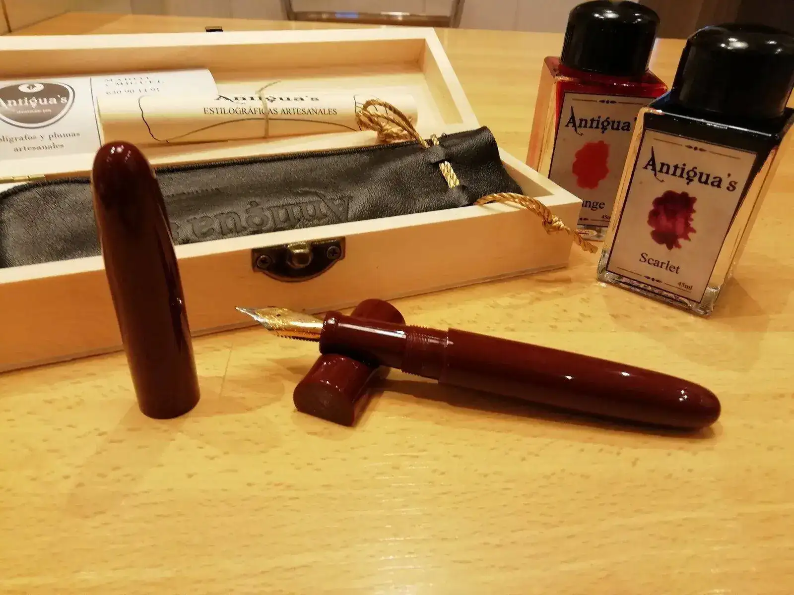 Hola, he comprado esta pluma a un vendedor que dice que se trata de una Antigua´s. Parece que es solo la palabra del vendedor original porque no tiene ni caja, ni ninguna marca reconocible. Es verdad que en la página web tienen algunos acrílicos idéntico en otros modelos. El plumín es como los Yinhao y escribe estupendamente. No he encontrado en Internet ningún modelo similar, igual vosotros lo conocéis.