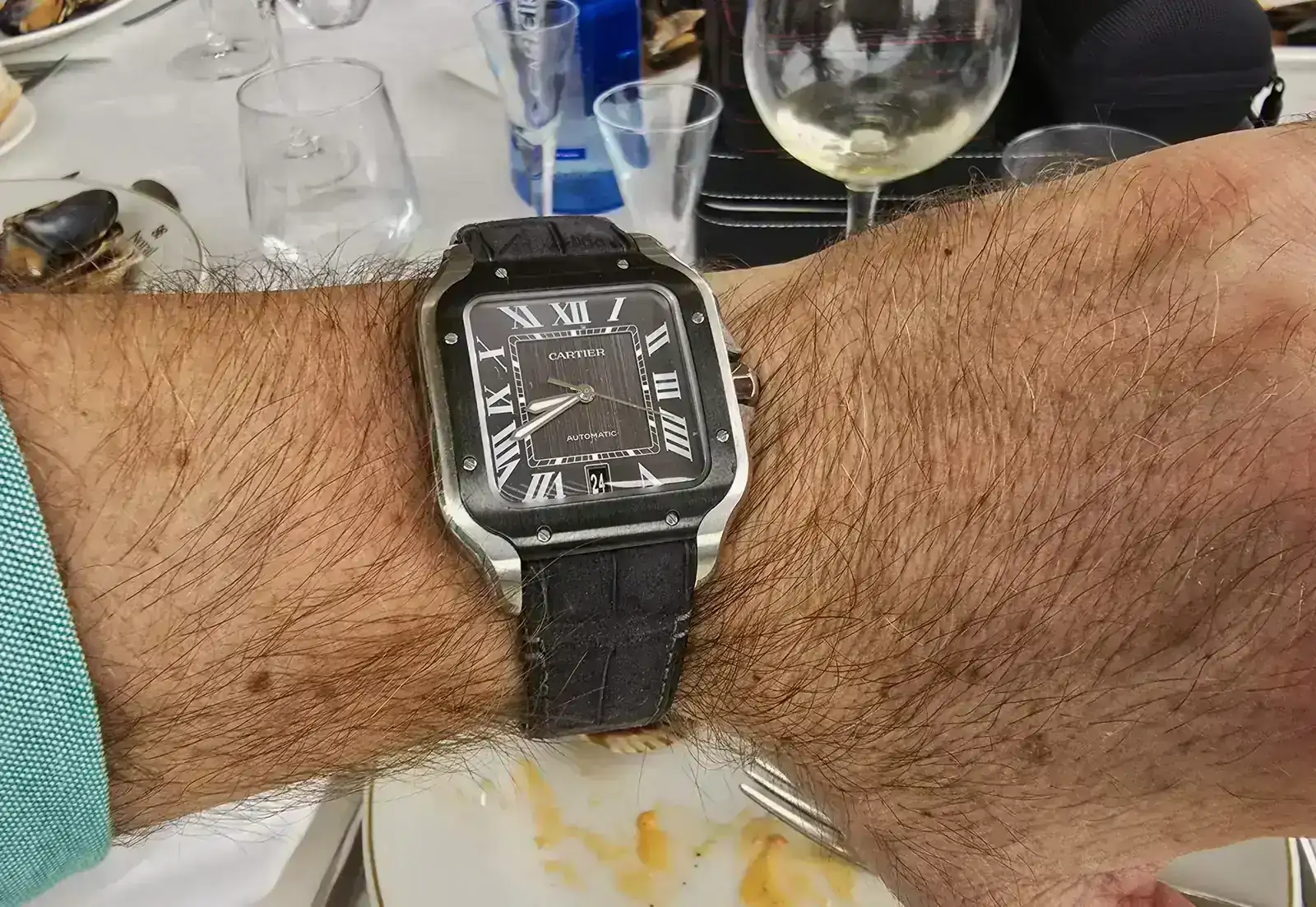 - Cartier: tiene el diseño más singular, y creo que puede cansar. Esa versión se me hace muy grande, y poco armónica. El tamaño mediano me resulta mucho más equilibrado, tallando ambos, más grandes que lo que sus medidas pueden hacer pensar. El bisel plano y pulido me harían descartarlo de inmediato. Diría que es el más refinado en acabados exteriores, pero por su diseño para mí, no lo hace opción como único reloj. No tiene corona roscada, algo que valoro mucho. Escogería blanco, ya que el azul lo veo muy oscuro, y el efecto con los índices brillo, extraños. Calibre, mismo que el anterior.