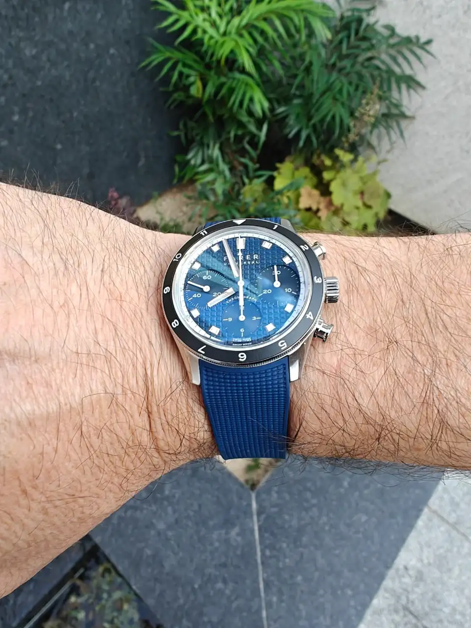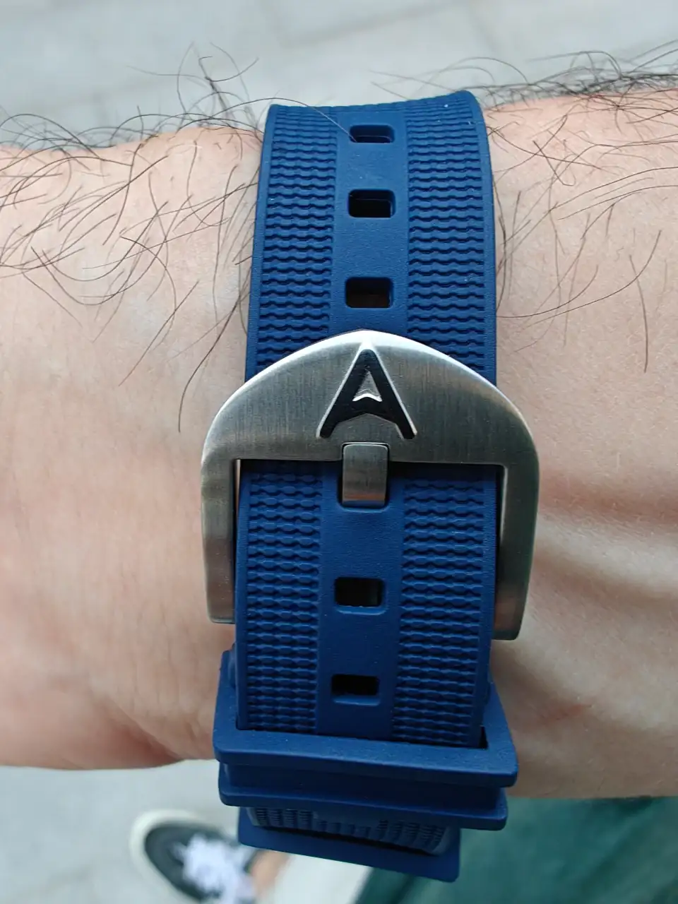 Que más. La correa muy cómoda, se ve que está diseñada a medida para este reloj, con esa doble curvatura que tiene en el encastre al reloj. El cierre de la correa es de titanio.