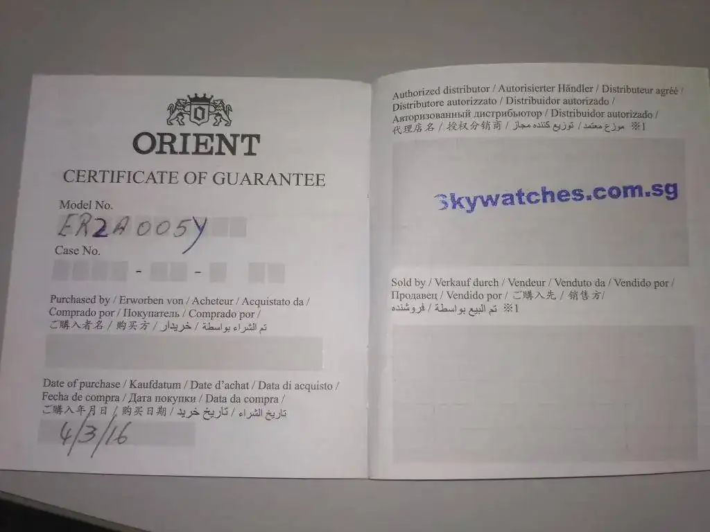 Buenas tardes. En marzo del año pasado compré un Orient modelo ER2A005Y en la tienda Skywatches.com.sg.