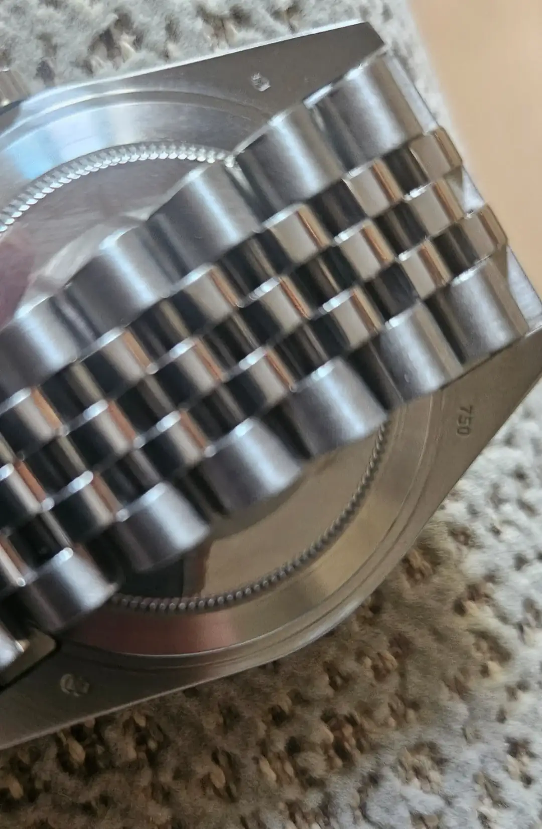 Hola saludos 🤗 creo que no llevo ni un dia en este foro pero como comenté en mi presentación quiero subir un poco de nivel con la búsqueda y compra de otro reloj para aumentar mi pequeña colección, estoy hablando de Rolex, tengo uno a la vista que me gusta y el precio creo que es justo y lógico para este tipo de reloj, el reloj que estoy mirando es un Datejust 41mm del 2020,el tema es el siguiente en unas de las fotos que me manda el vendedor (particular) observo en la parte trasera de la caja unas grabaciones en uno de los picos la marca de 750 en las otras 3 restantes la corona de Rolex, se que el 750 es la pureza del oro del objeto que sea, 750 micras de oro por cada 1000 micras,el caso que este reloj lo único que tiene de oro es el bisel en este caso es de oro blanco, esto me desconcierta un poco y aunque el vendedor me asegura que es auténtico y me lo manda con su caja y documentación no me gustarÃa dar un paso en falso si alguien que controle del tema me puede aclarar algo lo agradecerÃa muchas gracias de antemano adjunto imagen.
