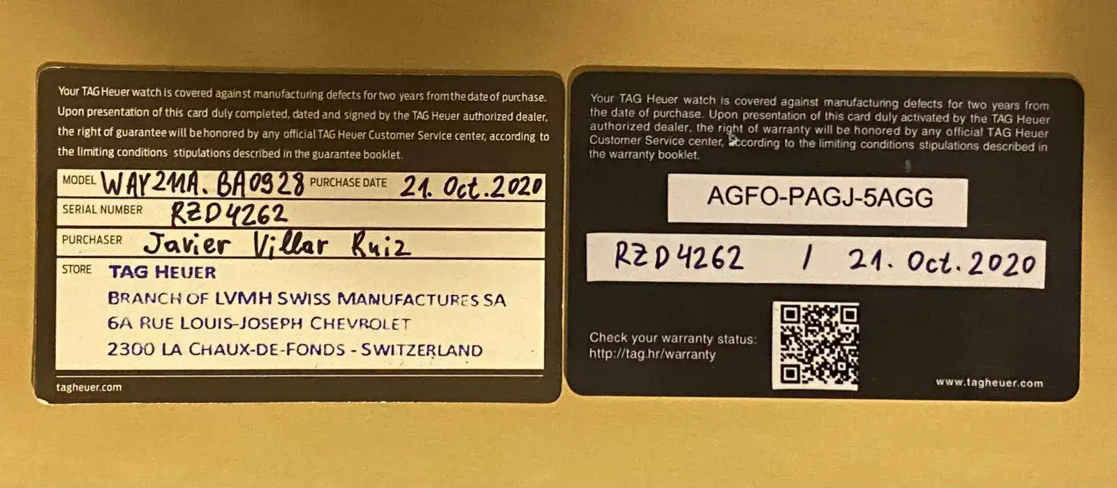 Adjunto fotos de las tarjetas del Carrera y el Aquaracer (este reloj trae dos tarjetas) y fotos del reloj.