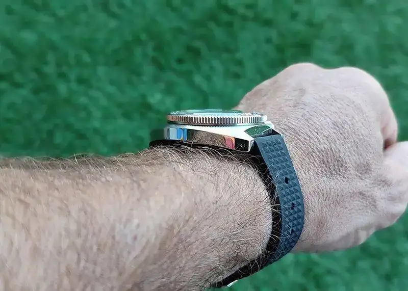 Conclusión... no me es un reloj cómodo de llevar se tambalea mucho en mi muñeca porque descansa sobre una base abombada demasiado saliente, sus 100g. de peso no ayudan mucho.