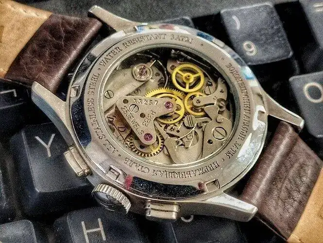 El Strela de Leonov, seguro que no llevaba fondo visto. Este, sí. Y así, podemos observar en toda su magnitud (la que permiten sus 38 mm de caja) el calibre Poljot 3133. 🧐