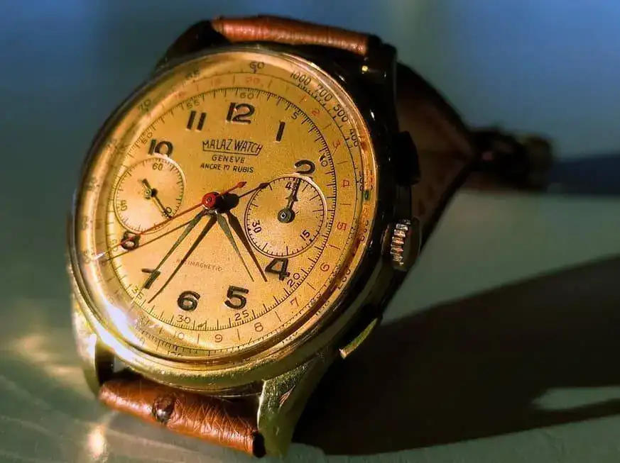 Es un Malaz Watches (marca suiza, desparecida hace mucho tiempo, por la crisis del cuarzo), que compró mi padre en 1947, y que me dió hace muchos años. Dentro lleva otro Venus. En este caso un Venus 188, aunque su fondo sin cristal impide su visión.