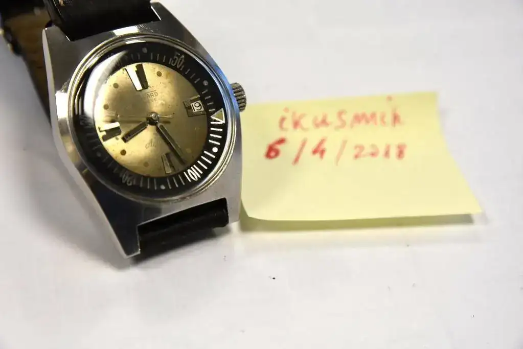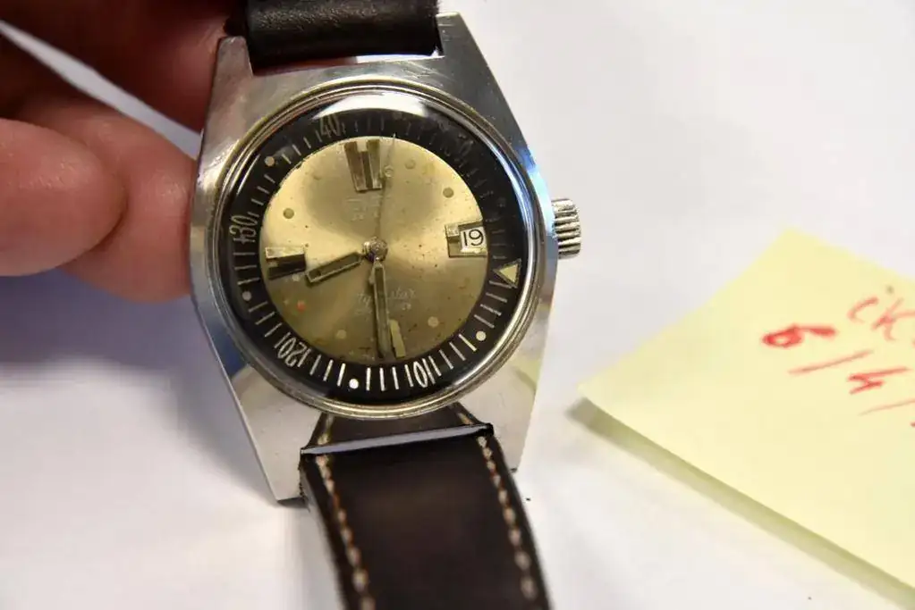 Hola, vendo éste vintage Duward color champan original con alguna herida de guerra en el dial y las agujas. El bisel interno no gira, perdería la ruletilla que llevan. La correa de piel gordita pero viejita, era de un Certina. Cristal impoluto. Funciona bien. no cambios.