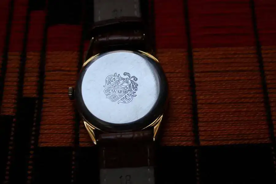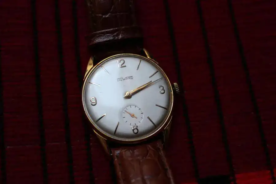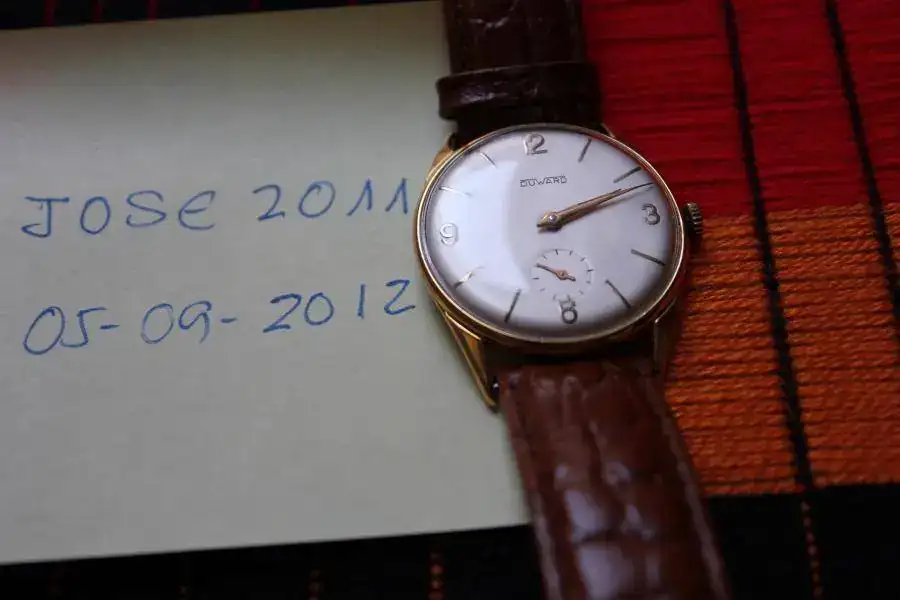 DUWARD de 34 mm. Chapado en oro, (entre las asas tiene un sello y un texto) es de remonte manual con 15 rubís, la esfera y el cristal están perfectas, espero que se pueda apreciar en las fotos, la caja y la tapa también están en un magnifico estado, teniendo en cuenta el tiempo que tienen, es un verdadero placer darle cuerda, no he controlado su exactitud.