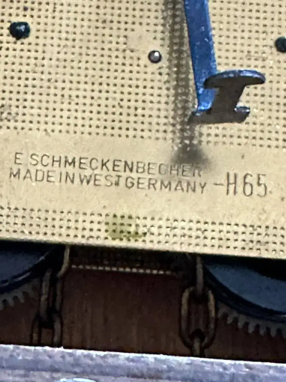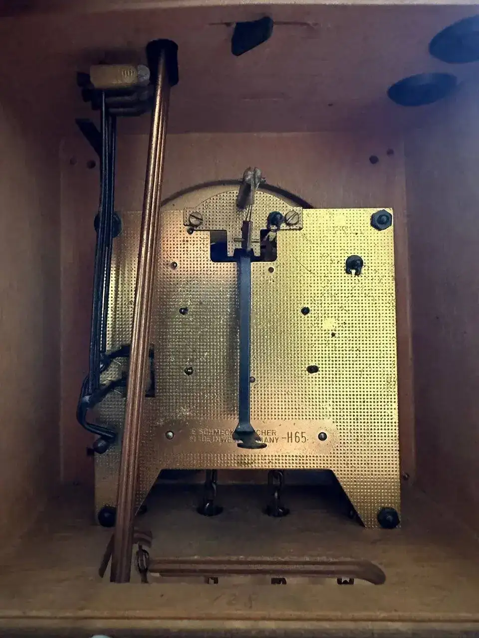 Buenas tardes amigos, me han regalado un reloj de pared, concretamente el E SCHMECKENBECHER H-65 MADE IN WEST GERMANY, tiene sus pesas, pero le falta la pieza que va desde la suspension a la barra del trinquete y el pendulo.
