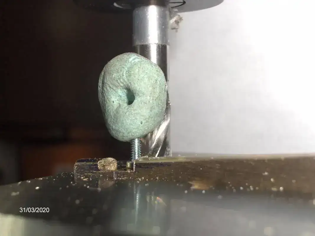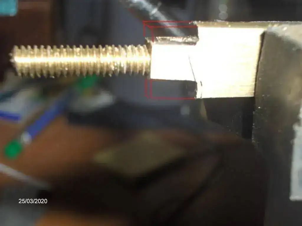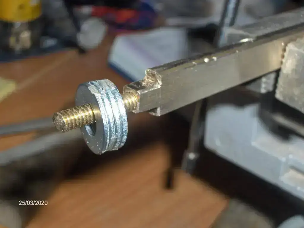 Es algo chapuza pero ponerme a hacer roscas nuevas tanto en las piezas de bronce de la suspensión y en la guía del péndulo , así como tener que hacer nuevas roscas en los 2 extremos del vástago me suponía bastante incordio. Además solo tengo disponible machos pero no terrajas para un M4 que seira algo asimilable a lo que trai de fabrica. Además en las piezas de bronce al estar ya hecha la rosca , tendría que hacer el agujero más grande del que tiene ahora y no quedaría mucha "carne" para un M4 en una pieza que tiene espesor 5 mm. Ergo teflón, puede que cuando todo esté bien , ponga unas gotas de Loctite.
